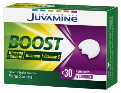 Juvamine Boost Ginseng Guarana Vitamin C 30 Tablets To Crunch Is A Food Supplement Based On Plants And Vitamin C With Sweetener. It Is Particularly Indicated For Periods Of Decline In Shape Caused By Everyday Challenges, Sports Challenges, Exams Or Other Stressful Situations. To Face To, Its Formula Contains Siberian Ginseng Known For Its Properties Of Physical And Intellectual Stimulant. It Allows You To Be At The Top Of Your Capabilities In All Circumstances. Guarana Reduces Intellectual Tiredness. Vitamin C Also Contributes To Reduce Tiredness. Sugars Free. Contains A Source Of Phenylalanine. Red Fruits Flavour. Made In France
