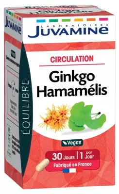 Juvamine Circulation Gingko Hamamelis 30 Capsules Is A Food Supplement In Form Of Capsule, Based On Ginkgo And Hamamelis, And Which Favours A Good Blood Circulation. This Food Supplement Is Formulated Based On Ginkgo Biloba Used For More Than 4000 Years In The Traditional Chinese Medicine. It Contains Also Hamamelis, That Effectively Contributes To The Resistance Of Blood Vessels And To A General Good Circulation. It Allows Thus To Favour A Sensation Of Light Legs. Product Made In France