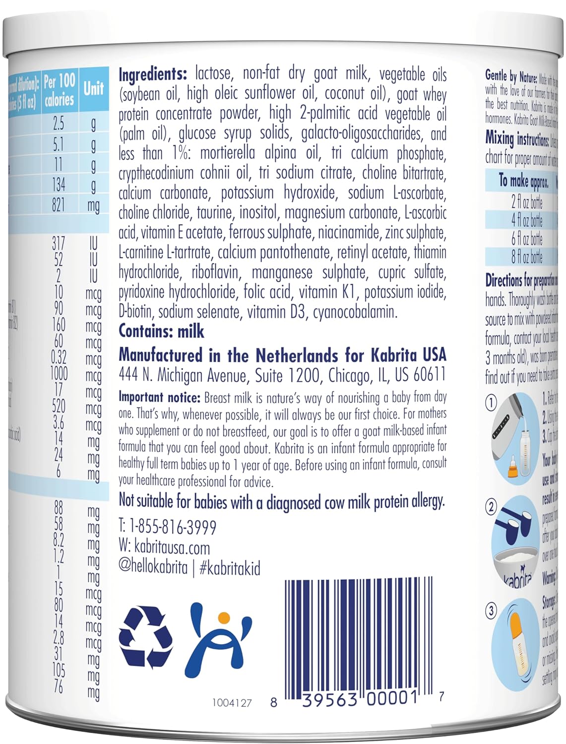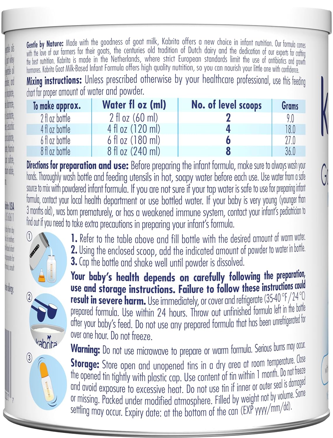Naturally Gentle Formula: Made with premium goat milk from the Netherlands, our baby formula is naturally easier to digest than cow milk formulas, and can help keep your newborn comfortable while combo feeding, supplementing, weaning, or when changing formulas due to sensitive tummies10Loved by Babies, Trusted by Parents: Kabrita has 75 years of experience in the formula industry, and more than 1.5 million babies are fed Kabrita formula every day. Its mild, sweet taste makes it a popular choice10Safe, High-Quality Infant Formula: Kabrita is the first and only European and goat milk-based infant formula brand to meet all FDA requirements. That means Kabrita infant formula meets both the strict European safety standards and rigorous FDA standards. Our formula contains no GMO ingredients10Clinically Proven Formula: More than just goat milk, our infant formula contains 25 essential nutrients including prebiotics, iron, vitamin D, folic acid, and a premium fat blend with beta-palmitate, DHA and ARA. We do not add corn syrup10Dedicated Customer Support Team: Questions or concerns about Kabrita We're here to help. You can try Kabrita Goat Milk Infant Formula confidently and add it to your baby's essentials