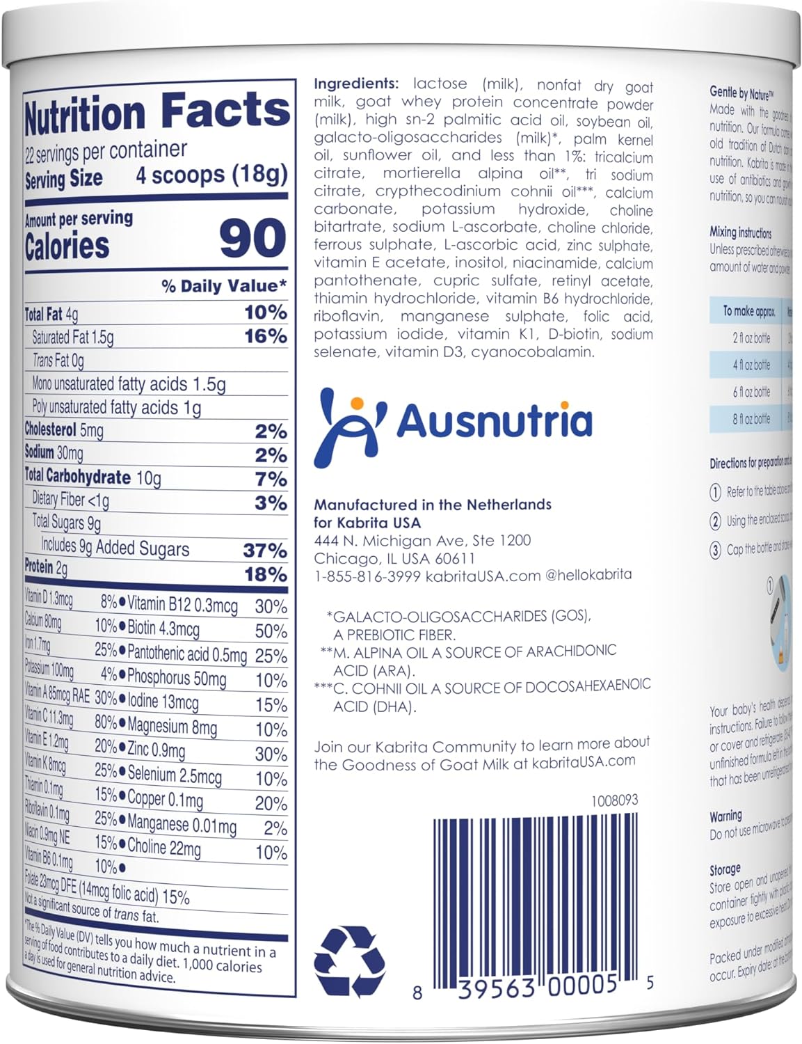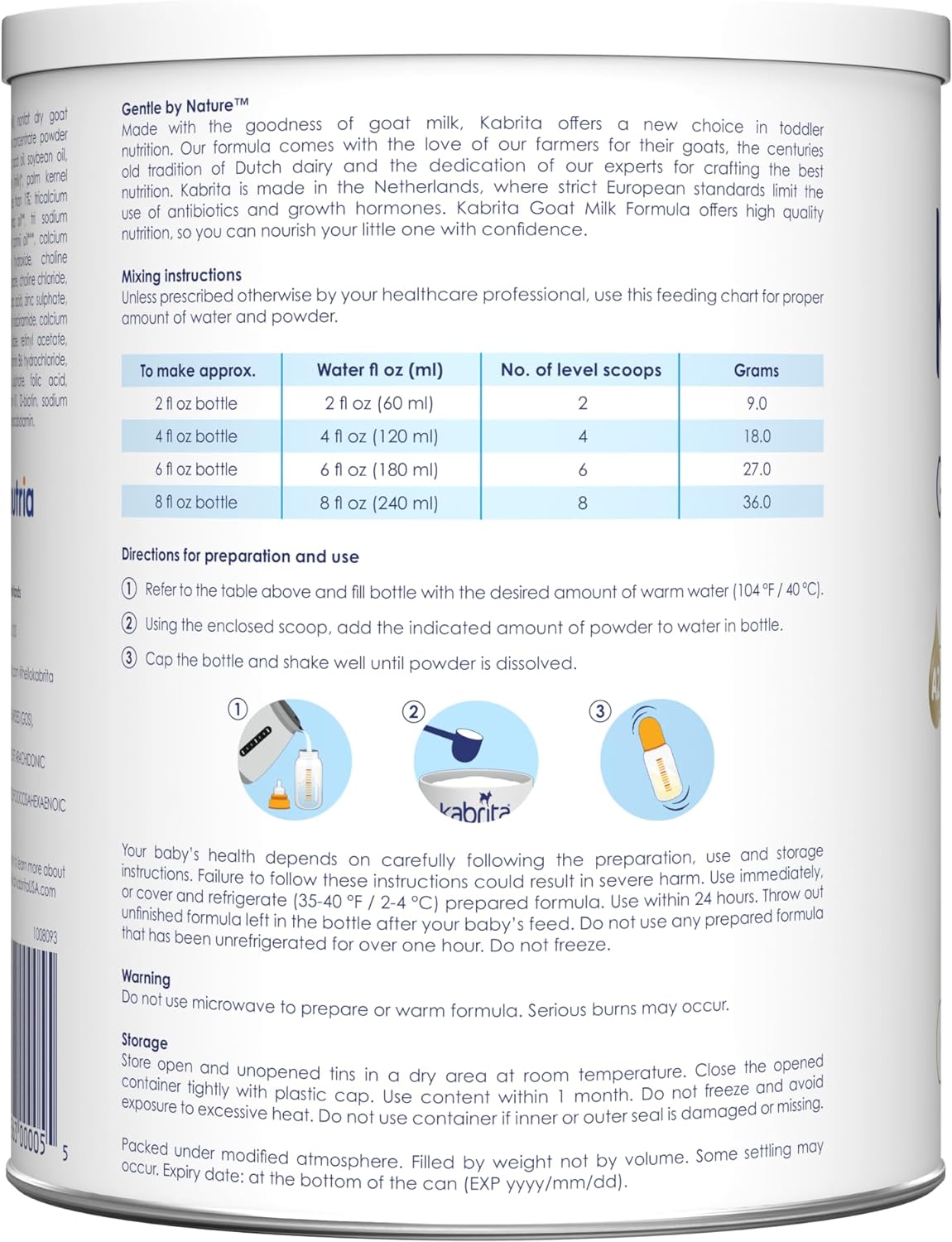 Your Toddler Will Love It: Made with premium Dutch goat milk, Kabrita is easy to digest and is specially created for your 12-24 month (1 to 2-year-old) toddler. Our naturally A2 milk formula will help keep your little one comfortable while supplementing, weaning, or when changing formulas due to tummy troubles10Gentle on Sensitive Tummies: Kabrita is a great cow milk alternative for children who experience minor issues associated with cow milk consumption. Its mild, sweet taste makes it a popular choice, even among picky eaters. We also use an adapted whey-to-casein protein ratio for even better digestibility1024 Vitamins and Minerals: More than just plain goat milk, our A2 formula is fortified with important micronutrients recommended for use in baby formula. These include vitamin D, vitamin C, DHA, iron, and much more to support your growing child’s nutritional needs10Easy to Prepare: Just follow our simple 1:1 ratio by adding 2 ounces of water for every 2 scoops of powder. Fill the bottle with water before adding any powder to ensure accurate measurement. Adding water to powder can over-concentrate any baby & toddler formula10Dedicated Customer Service Team: Questions or issues with Kabrita We're here to help. You can try Kabrita Goat Milk Toddler Formula confidently and add it to your toddler essentials