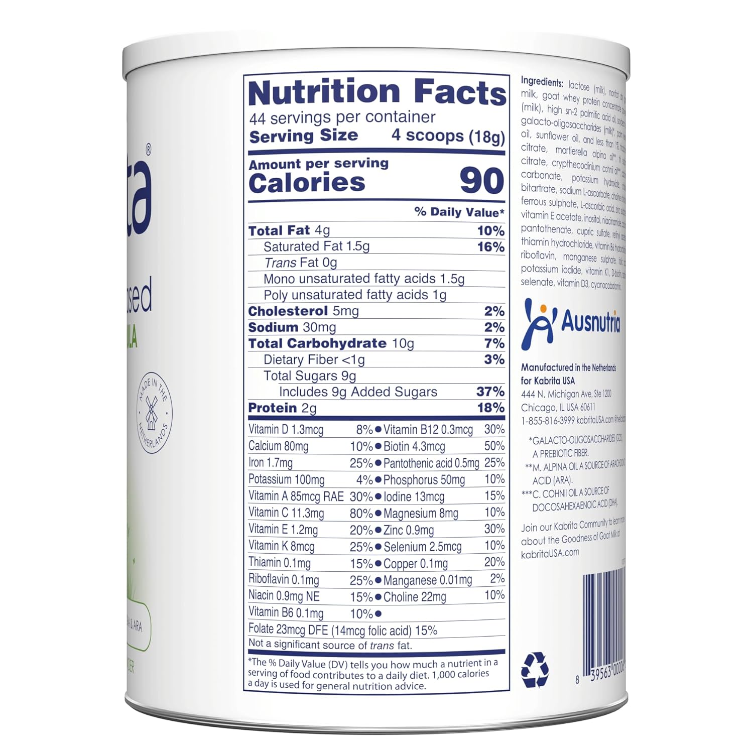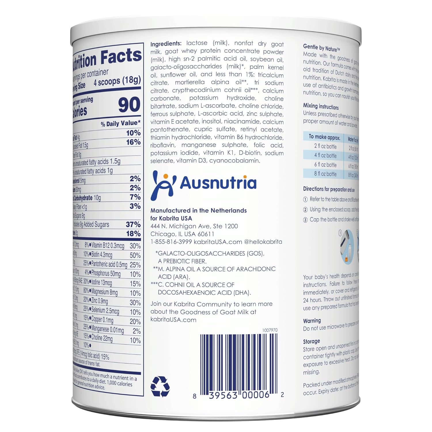 About this item Naturally easy to digest, premium non-GMO goat milk formula, ideal for weaning and supplementing. May be a solution for children with cow milk sensitivity*. Tummy troubles, congestion, and eczema may be associated with cow milk sensitivity. *not suitable for children with cow milk protein allergy Kabrita Goat Milk Formula has a mild, sweet and fresh taste and smell. A safe, effective and nutritious alternative to homemade goat milk formula recipes. Nutritionally fortified goat milk formula with 22 vitamins and minerals including folic acid, DHA, ARA, and iron. Our playful, happy goats are raised on family farms and graze on fresh grasses. Kabrita formula is free from hormones, antibiotics, heavy metals and is the only US formula to be certified glyphosate pesticide free. See more product details,Naturally easy to digest, premium non-GMO goat milk formula, ideal for weaning and supplementing,May be a solution for children with cow milk sensitivity*. Tummy troubles, congestion, and eczema may be associated with cow milk sensitivity. *not suitable for children with cow milk protein allergy,Kabrita Goat Milk Formula has a mild, sweet and fresh taste and smell. A safe, effective and nutritious alternative to homemade goat milk formula recipes,Nutritionally fortified goat milk formula with 22 vitamins and minerals including folic acid, DHA, ARA, and iron,Our playful, happy goats are raised on family farms and graze on fresh grasses,Kabrita formula is free from hormones, antibiotics, heavy metals and is the only US formula to be certified glyphosate pesticide free