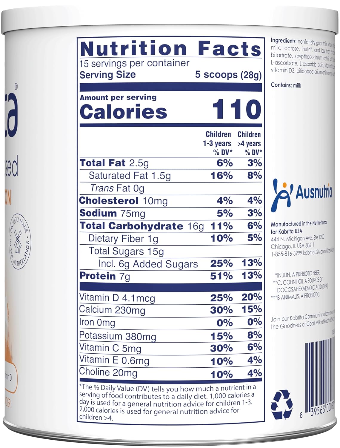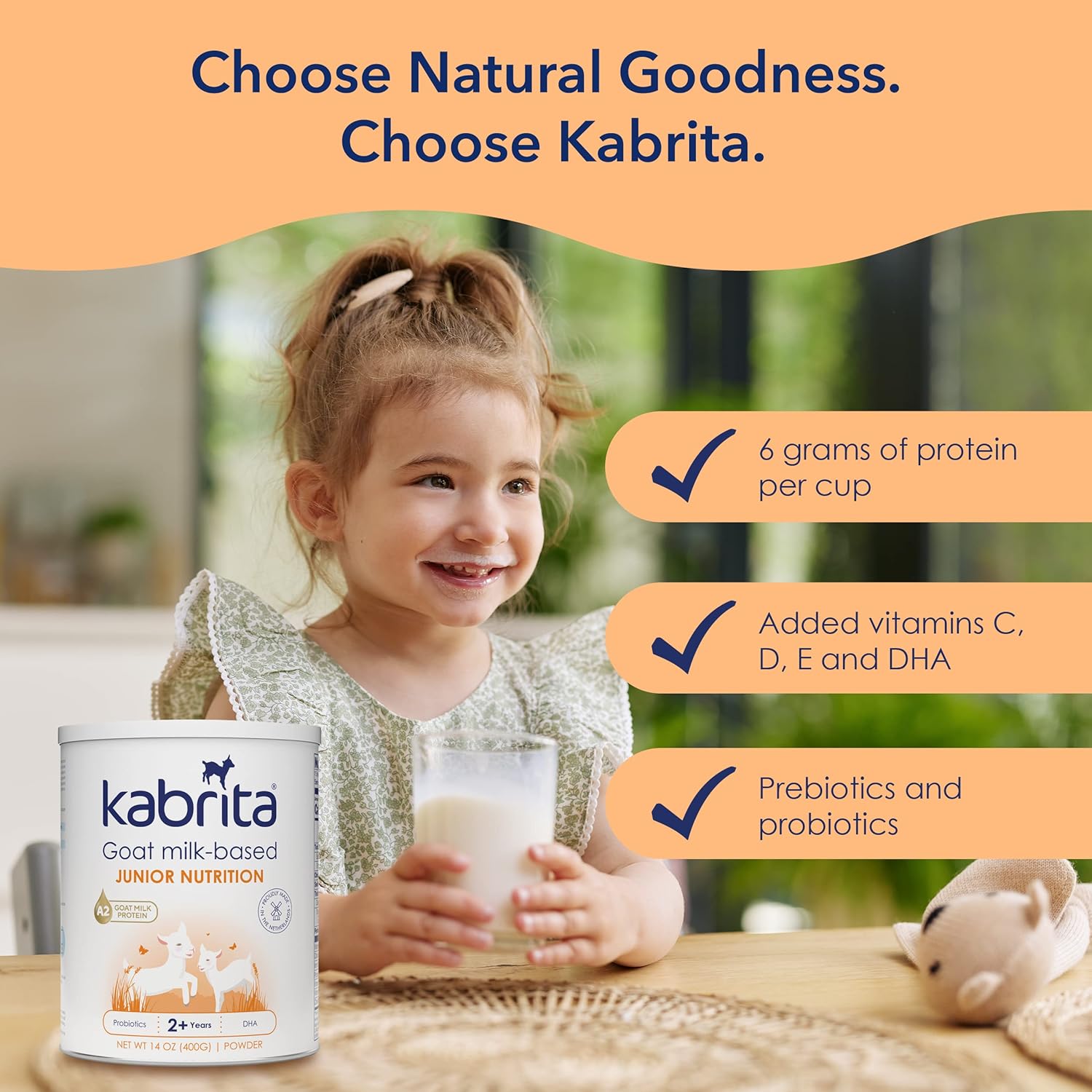 About this item HIGH-QUALITY GOAT MILK POWDER FOR KIDS: Kabrita Junior is easy to digest, highly nutritious & fortified with essential nutrients, supporting natural growth & development in children ages 2-7. CLEAN & SAFE POWDERED MILK FILLED WITH NUTRIENTS: Kabrita Junior Nutrition powdered milk is highly nutritious goat milk adhering to strict European standards, which limit antibiotics & hormones. Our powdered milk is non-GMO, and easy to digest. SUPPORT IMMUNITY, GUT HEALTH & DEVELOPMENT: Our goat milk powder is fortified with Vitamins C, D, & E, calcium, gentle A2 protein, added prebiotic fiber inulin, and probiotic B Animalis to support a balanced gut and better digestion in little ones. MADE IN THE NETHERLANDS: We created Kabrita Goat Milk Junior Nutrition without any GMO ingredients and following strict European standards, which limit the use of antibiotics and growth hormones. Kabrita products are based on sound science, and our development team has a program specializing in goat milk research. QUICK AND CONVENIENT: With all the gentle benefits and great taste of goat milk, Kabrita Junior has a naturally sweet taste and smell that kids love. Add it to your child’s breakfast essentials or blend it into their favorite smoothie.  See more product details,HIGH-QUALITY GOAT MILK POWDER FOR KIDS: Kabrita Junior is easy to digest, highly nutritious & fortified with essential nutrients, supporting natural growth & development in children ages 2-7,CLEAN & SAFE POWDERED MILK FILLED WITH NUTRIENTS: Kabrita Junior Nutrition powdered milk is highly nutritious goat milk adhering to strict European standards, which limit antibiotics & hormones. Our powdered milk is non-GMO, and easy to digest,SUPPORT IMMUNITY, GUT HEALTH & DEVELOPMENT: Our goat milk powder is fortified with Vitamins C, D, & E, calcium, gentle A2 protein, added prebiotic fiber inulin, and probiotic B Animalis to support a balanced gut and better digestion in little ones,MADE IN THE NETHERLANDS: We created Kabrita Goat Milk Junior Nutrition without any GMO ingredients and following strict European standards, which limit the use of antibiotics and growth hormones. Kabrita products are based on sound science, and our development team has a program specializing in goat milk research,QUICK AND CONVENIENT: With all the gentle benefits and great taste of goat milk, Kabrita Junior has a naturally sweet taste and smell that kids love. Add it to your child’s breakfast essentials or blend it into their favorite smoothie