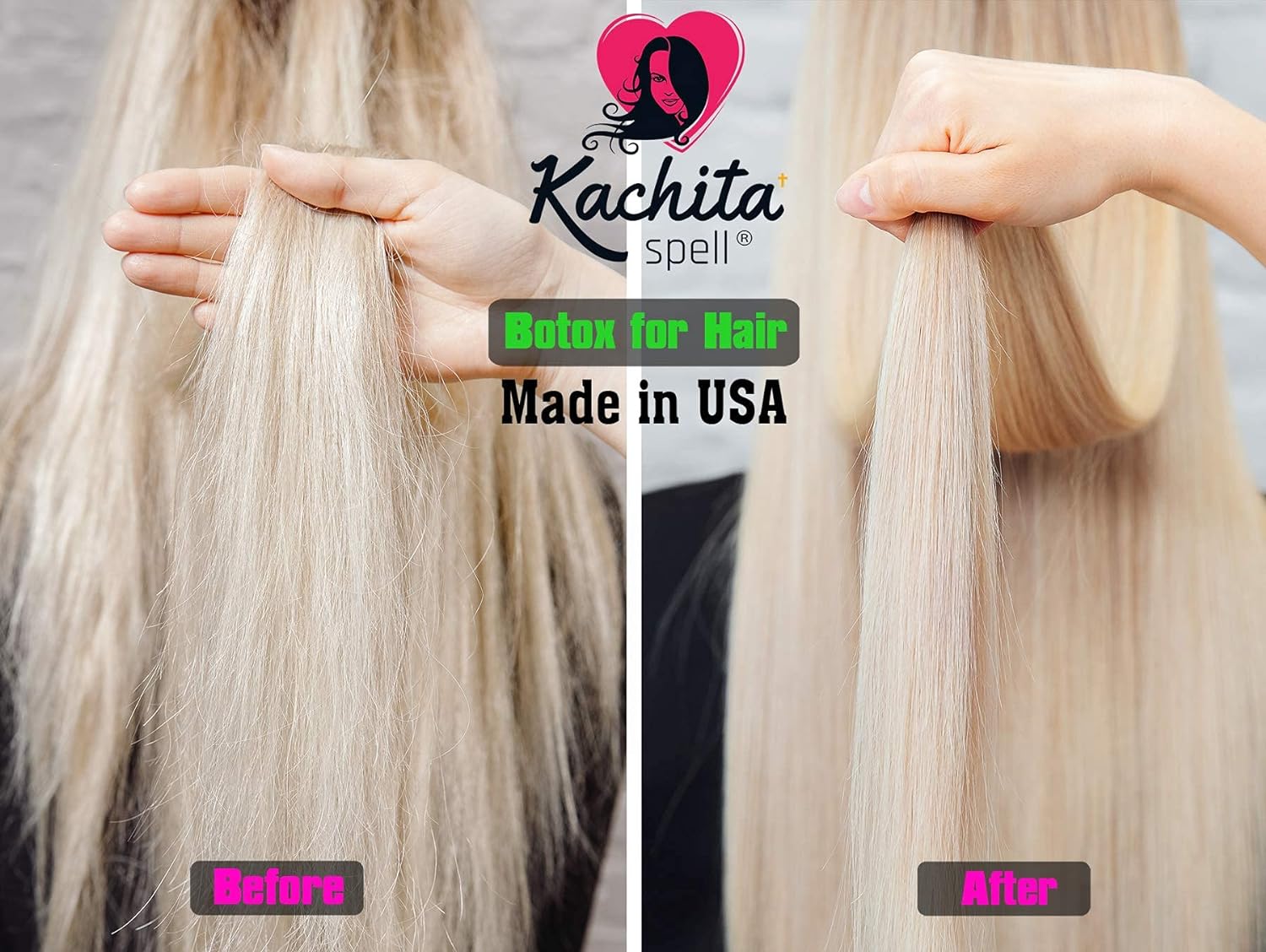 ABOUT THE PRODUCT: 1 > Antiallergic Formula Formaldehyde FREE, all hair types 16oz. Intensive Treatment Repair, Moisturizing and Anti Frizz Hair 2 > Intensive Hair Botox Treatment with reconstructing power. Repair damaged hair leaving your hair soft, shiny, and silky. The best quality to help you get your desired healthy hair 3 > Botox for Hair provide Deep hydrating and moisturizing action. Enriched with a blend of oils and Amino Acids Kachita Spell Botox4Hair Treatment Original. What is a Botox Hair Treatment The Hair Botox for Hair is the latest, non-invasive, repairing treatment formulated to restore vitality to hair that has been damaged by chemical processes, straightening, and blow-drying. This effective treatment promises to make your dull and aging hair look young and healthy again. The formula generates its rejuvenating power from a blend of powerful antioxidants, proteins, and essential nutrients. The Botox for Hair or Botox Capilar solution fills cracks in the hair shaft, replenishes lost protein, and it also provides intensive hydration, repairs split ends, reduces frizz, and adds a beautiful shine to your hair. The treatment nourishes strands from the inside out and gives the hair a smoothing effect without taking away volume. Made in USA Instruction: How to use HOT Way: Wash and rinse your hair two times with Kachita Spell sulfate-free shampoo. Remove excess of water from the hair and apply the product uniformly. Use a comb to get it to distribute the product on the surface as well as inside the hair. Cover the hair with a plastic cap and put it in the pedestal dryer between 15 to 20 minutes. Then rinse and continue to dry with a hand dryer and finally use the flat iron steam. How to use COLD Way: Wash and rinse your hair two times with shampoo Kachita Spell sulfate-free. Remove excess water from the hair and apply the product evenly. Use a comb to get the product distributed on both the surface and inside the hair. Leave the treatment for 8 - 10 minutes. Finally rinse the hair and dry with a towel. Note: The smoothing effect will be gradual in very curly and resistant hair. At each application, the affect will be stronger. We recommend a 15-days pause between applications. BotoxMax made in USA
