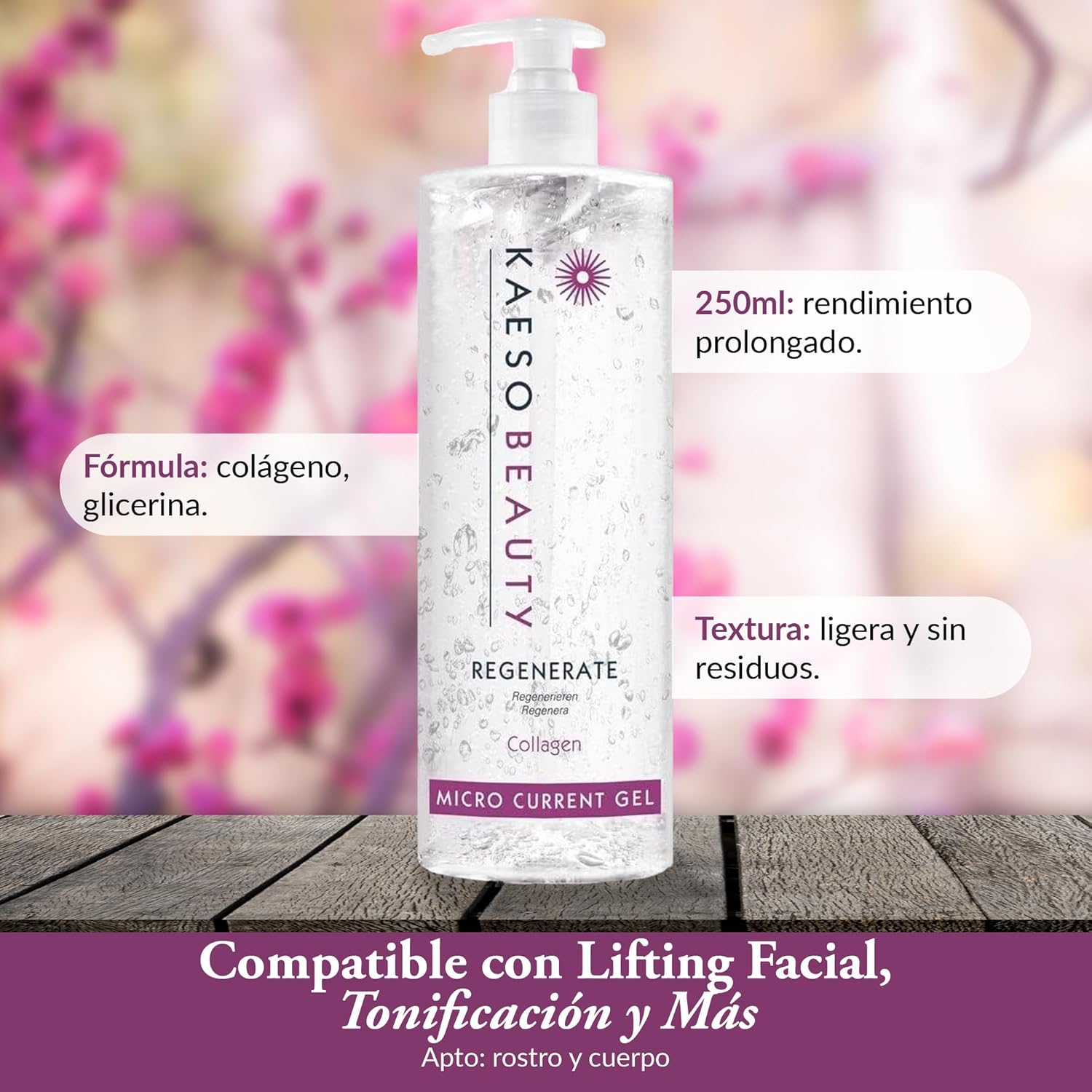 Product description Kaeso Micro Current Gel is a non-surgical face-lift gel designed to brighten, tone and firm the skin. Ideal for use with non-surgical face lift machines. Directions: Follow individual manufacturer's guidelines carefully. Apply gel to treatment areas. For moisturizing and conductivity purposes, do not use gel for more than 30 minutes continuously without re-applying more gel. Ingredients No mineral oils, no parabens, no sulphates,PROFESSIONAL SALON,REGENERATE COLLAGEN,MICRO CURRENT GEL,250ml