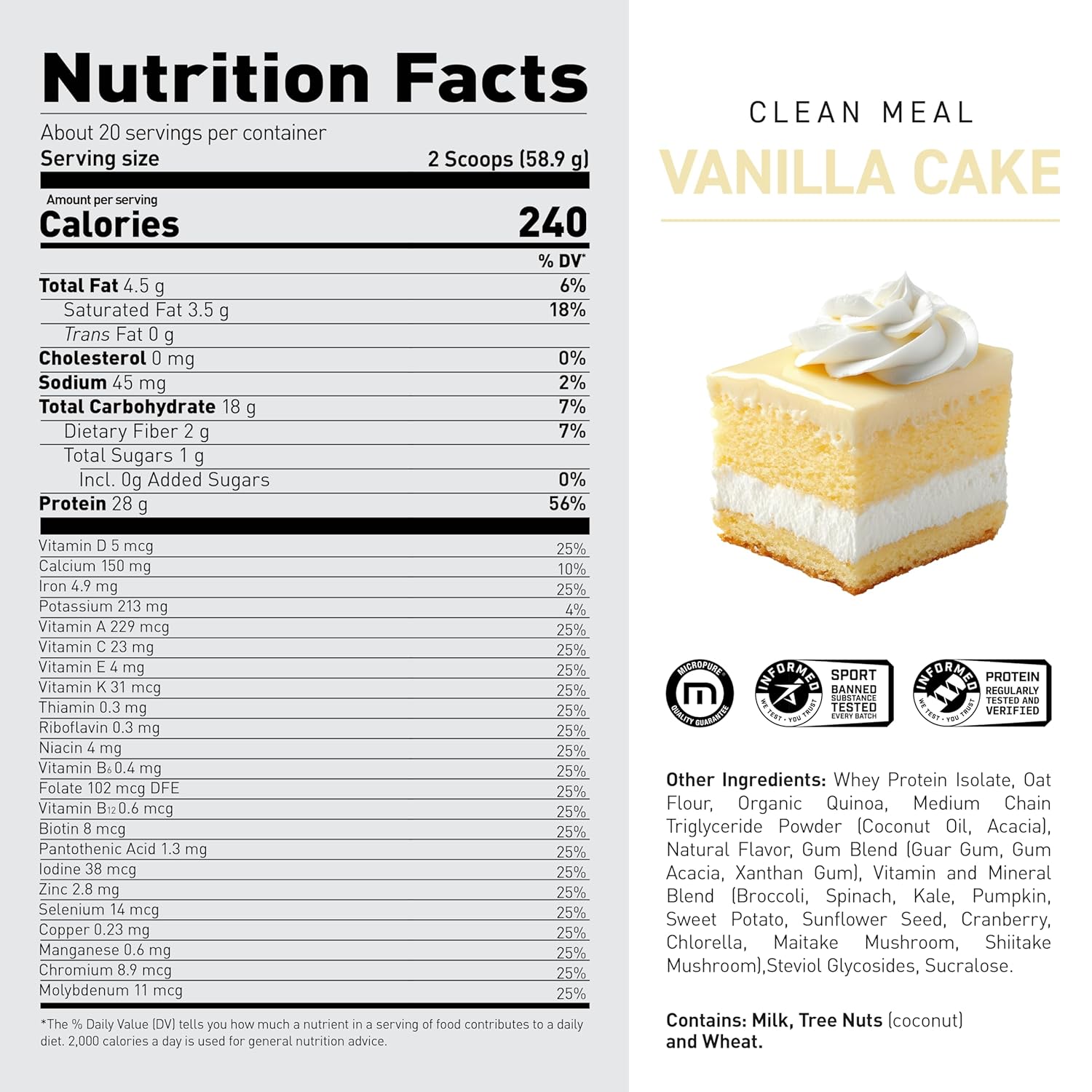 About this item Premium Meal Replacement with High-Quality Ingredients: Clean Meal combines 28g of premium whey protein isolate, a top-tier protein powder with slow-burning carbs from Swedish oats and organic quinoa, plus healthy fats from organic coconut MCT oil to provide complete and balanced nutrition. Convenient and Complete Nutrition: With just two scoops and water, you can create a creamy, delicious meal replacement shake in seconds. Replace up to two meals daily or enjoy a quick, nutrient-packed snack anytime you need a boost. Packed with 21 Organic Vitamins and Minerals: Clean Meal isnât just a whey protein powder; itâs a fully loaded meal replacement packed with 21 vitamins and minerals from organic fruits and vegetables, including essential nutrients like vitamin C, vitamin D, iron, and calcium. Satisfying and Long-Lasting Energy: Thanks to slow-digesting carbs like Swedish oats and organic quinoa, Clean Meal crushes hunger, keeps you full, and provides the sustained energy you need to tackle your day. High-Quality Protein for Active Lifestyles: Clean Meal features premium whey protein and whey isolate protein powder, ensuring you get a high-quality source of protein to support muscle recovery, energy, and overall wellness. Risk-Free, Money-Back Guarantee: Try Clean Meal with confidence. If itâs not the cleanest, most delicious, and most complete whey protein powder or meal replacement youâve ever tried, return it for a full refundâno questions asked. See more product details,Premium Meal Replacement with High-Quality Ingredients: Clean Meal combines 28g of premium whey protein isolate, a top-tier protein powder with slow-burning carbs from Swedish oats and organic quinoa, plus healthy fats from organic coconut MCT oil to provide complete and balanced nutrition,Convenient and Complete Nutrition: With just two scoops and water, you can create a creamy, delicious meal replacement shake in seconds. Replace up to two meals daily or enjoy a quick, nutrient-packed snack anytime you need a boost,Packed with 21 Organic Vitamins and Minerals: Clean Meal isnât just a whey protein powder; itâs a fully loaded meal replacement packed with 21 vitamins and minerals from organic fruits and vegetables, including essential nutrients like vitamin C, vitamin D, iron, and calcium,Satisfying and Long-Lasting Energy: Thanks to slow-digesting carbs like Swedish oats and organic quinoa, Clean Meal crushes hunger, keeps you full, and provides the sustained energy you need to tackle your day,High-Quality Protein for Active Lifestyles: Clean Meal features premium whey protein and whey isolate protein powder, ensuring you get a high-quality source of protein to support muscle recovery, energy, and overall wellness,Risk-Free, Money-Back Guarantee: Try Clean Meal with confidence. If itâs not the cleanest, most delicious, and most complete whey protein powder or meal replacement youâve ever tried, return it for a full refundâno questions asked