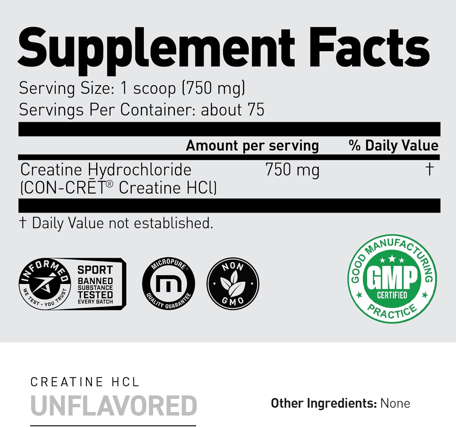 HIGHLY-ABSORBABLE & ULTRA PURE CREATINE HYDROCHLORIDE 750mg: If youâve experienced GI discomfort, or your gut and stomach simply donât agree with old-school creatine monohydrate, Creatine HCl could be the creatine solution youâve been looking for. Each serving delivers 750mg of ultra-pure creatine hydrochloride to fuel your workouts. It comes with our Micropure guarantee, and like all Kaged supplements, is third-party tested for purity, and free of banned substances