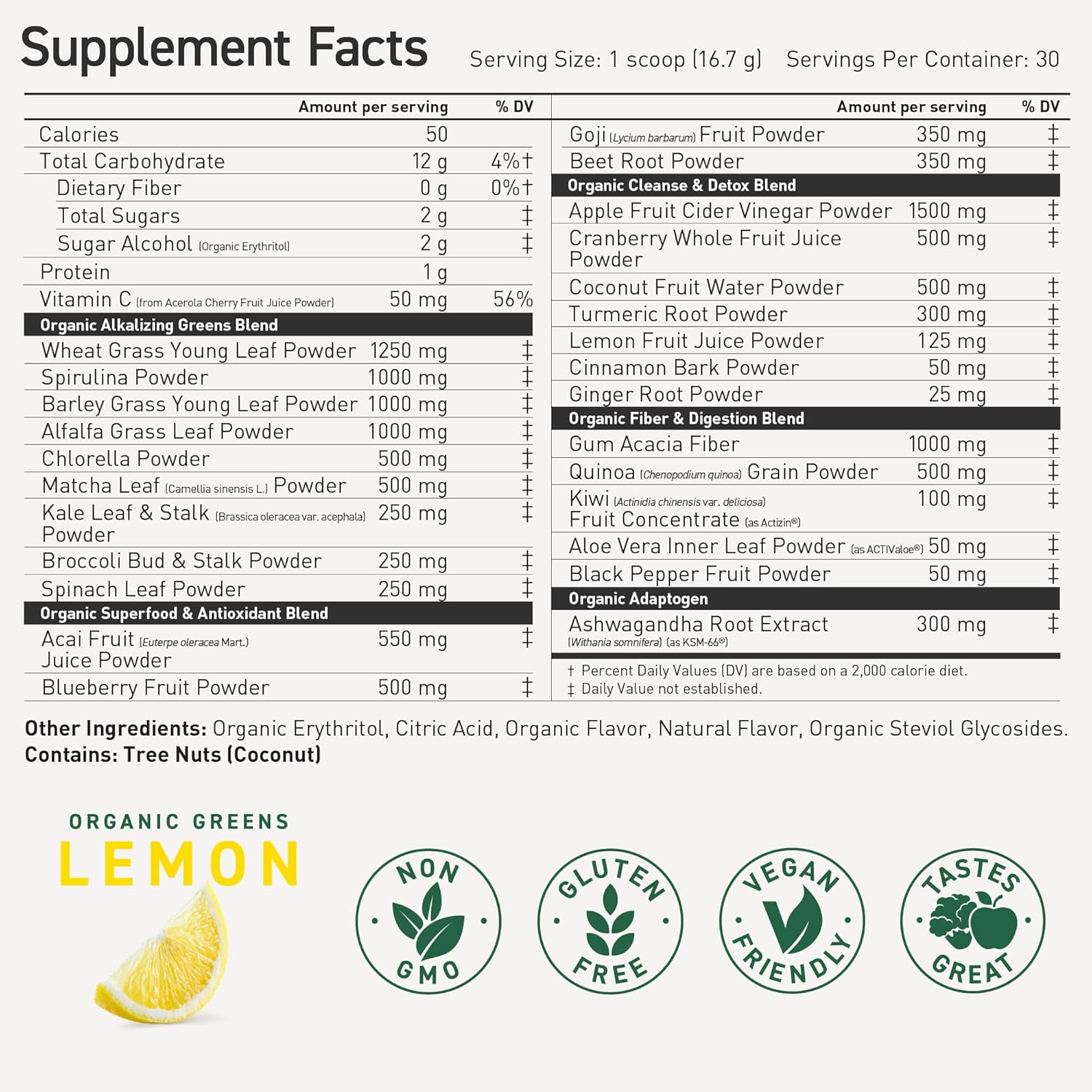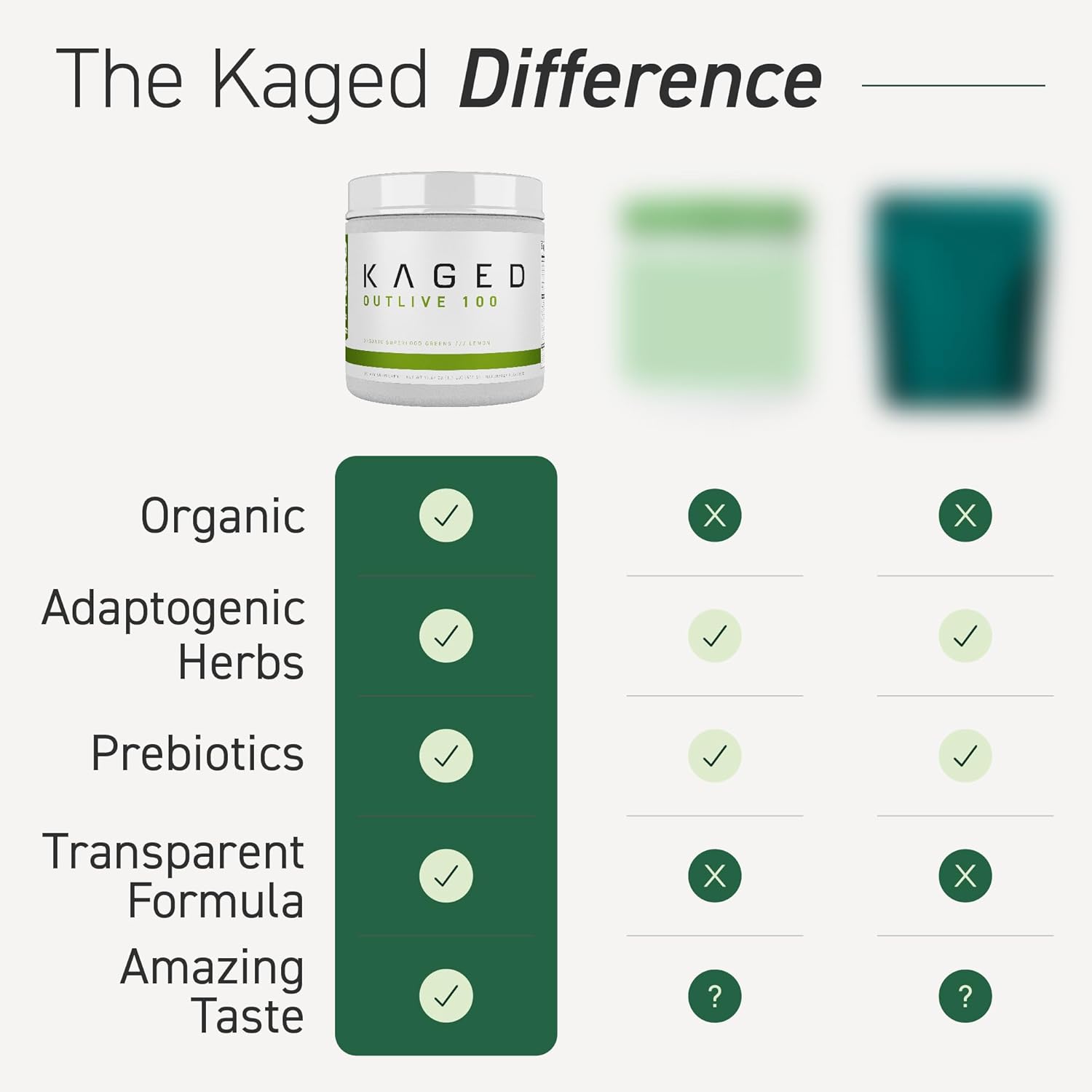 Kaged Organic Greens Superfood Powder | Lemon | Outlive100 | Wellness With Supergreens And Prebiotics | Apple Cider Vinegar | Ashwaghanda | 30 Servings