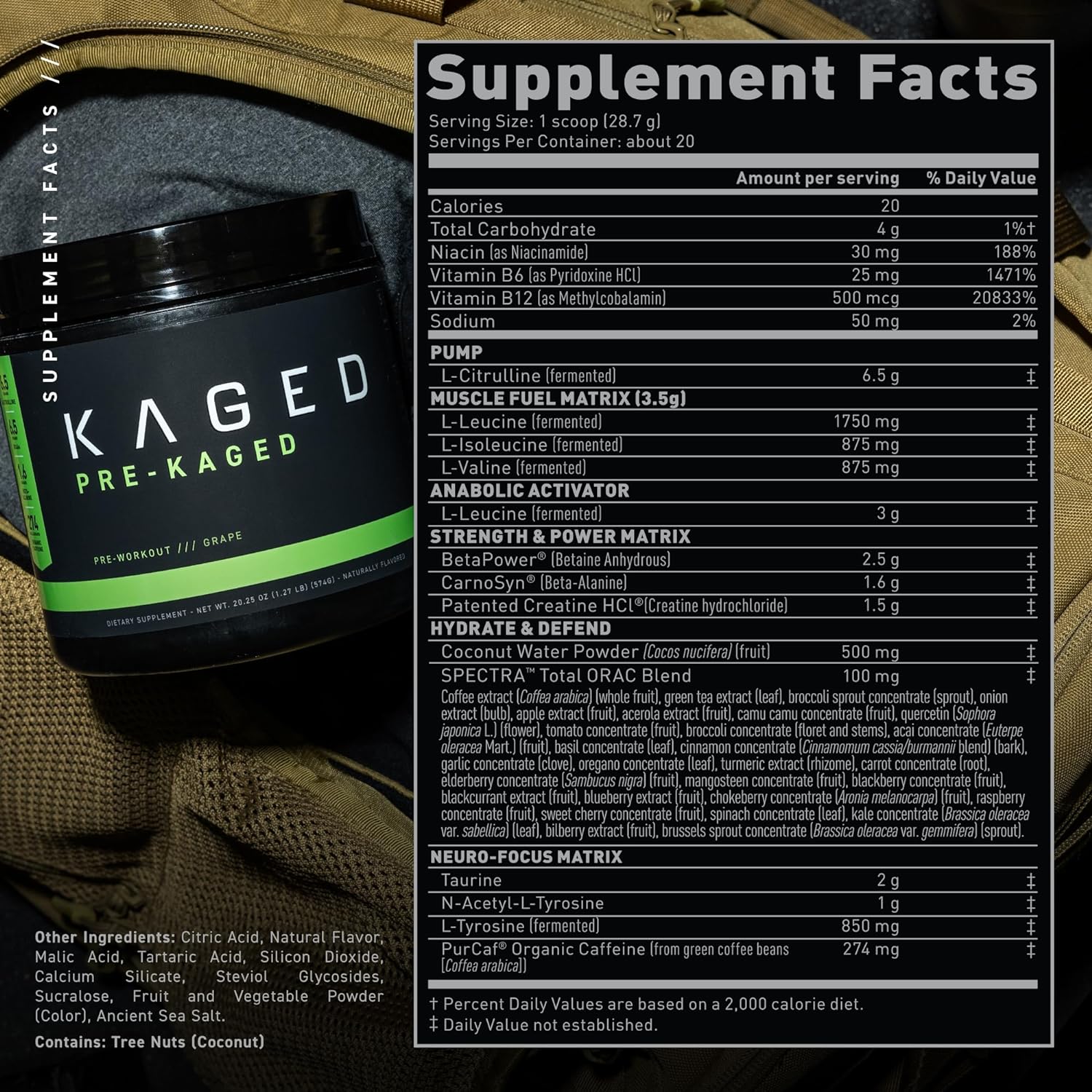 DESCRIPTION : Kaged Original Pre Workout Powder | Grape | Pre-Kaged | Formulated with Creatine, Beta Alanine, Pure Caffeine | 20 Servings