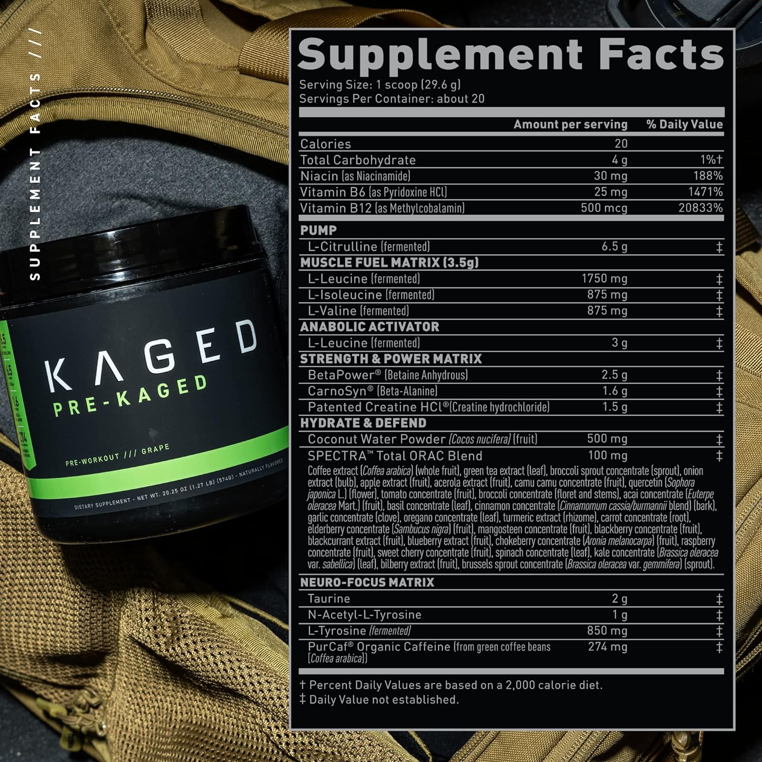 4 >The industry largest, most fully dosed scoop: With max dose ingredients, and a massive 32g per serving, just one scoop does it all. Kaged is a health-forward brand, so like all our products, PRE-KAGED has been 3rd party tested, screened for banned-substances, and our ingredient profiles are transparent. So, even the most meticulous athletes can see exactly what theyāre getting. Thereās a reason itās one of the highest-rated & most-awarded pre-workout supplements available