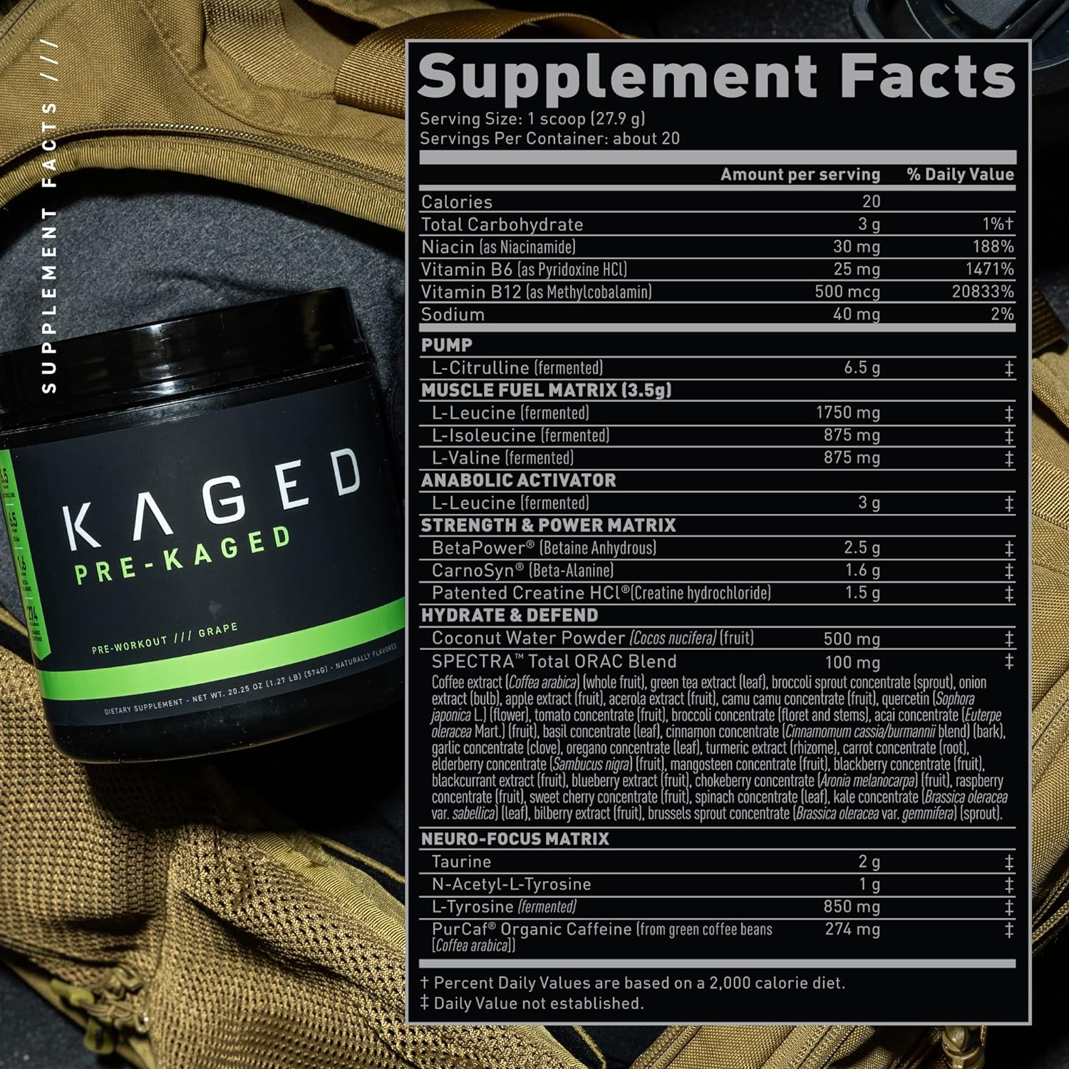 4 >THE INDUSTRY’S LARGEST, MOST FULLY DOSED SCOOP: With max dose ingredients, and a massive 32g per serving, just one scoop does it all. Kaged is a health-forward brand, so like all our products, PRE-KAGED has been 3rd party tested, screened for banned-substances, and our ingredient profiles are transparent. So, even the most meticulous athletes can see exactly what they’re getting. There’s a reason it’s one of the highest-rated & most-awarded pre-workout supplements available
