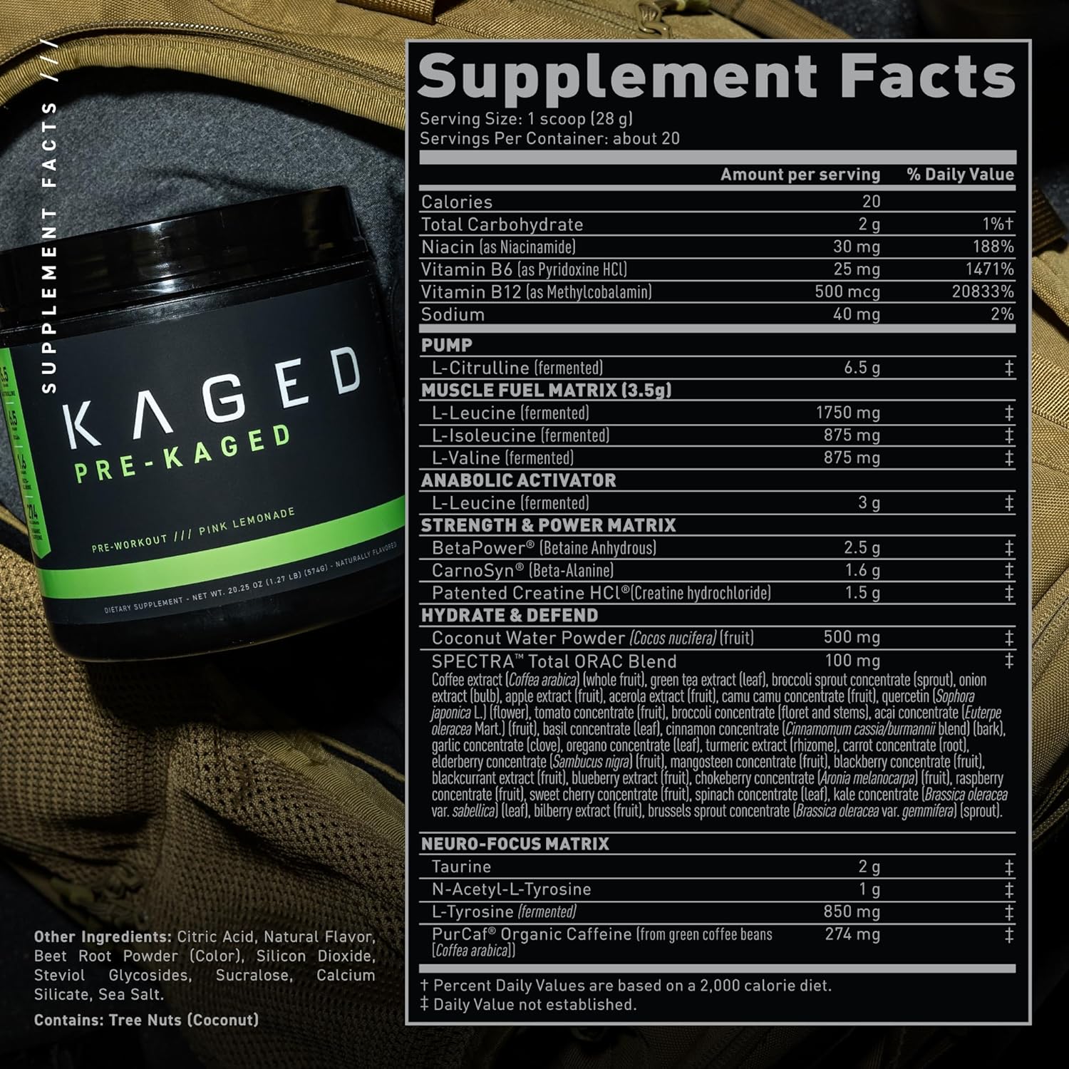 4 > THE INDUSTRY’S LARGEST, MOST FULLY DOSED SCOOP: With max dose ingredients, and a massive 32g per serving, just one scoop does it all. Kaged is a health-forward brand, so like all our products, PRE-KAGED has been 3rd party tested, screened for banned-substances, and our ingredient profiles are transparent. So, even the most meticulous athletes can see exactly what they’re getting. There’s a reason it’s one of the highest-rated & most-awarded pre-workout supplements available