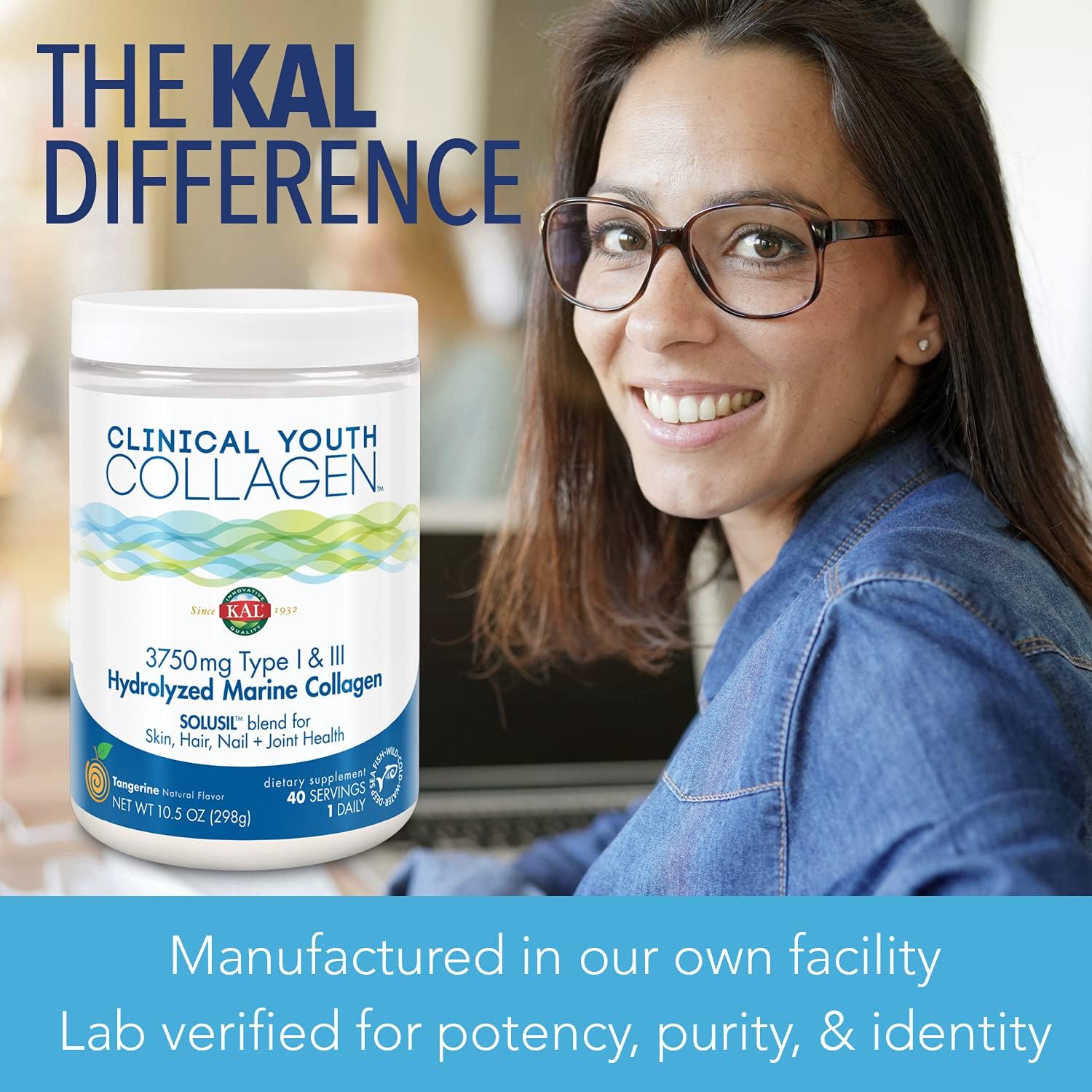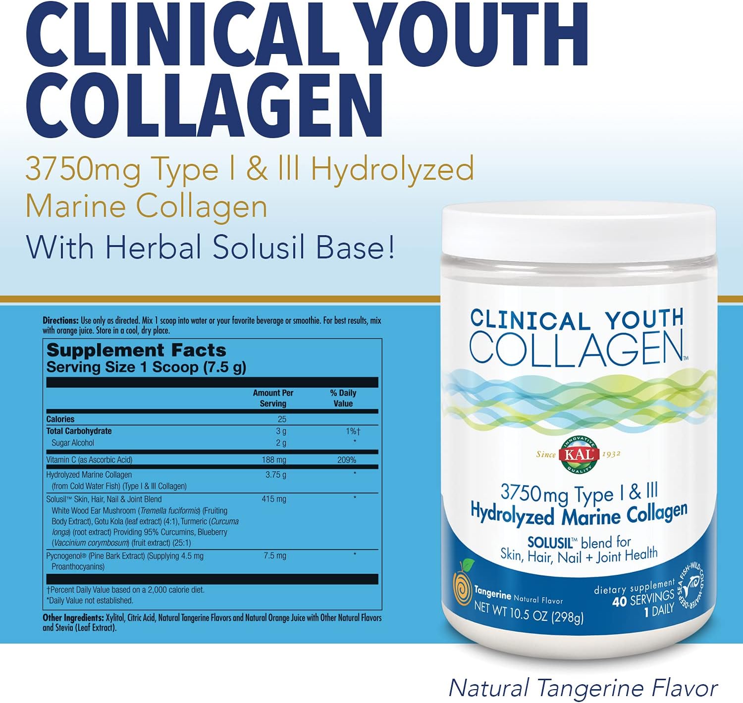 Kal Clinical Youth Collagen | Healthy Skin, Hair, Nail And Joint Support | Vitamin C | Natural Tangerine Flavor | 10.5Oz, 40 Serv