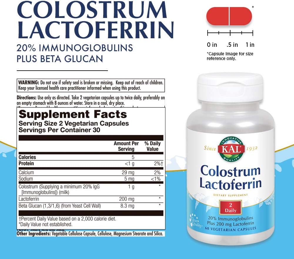 Kal Colostrum Lactoferrin, 20% Immunoglobulins | Lactoferrin & Beta Glucan | Healthy Immune Support | 30 Serv | 60 Caps