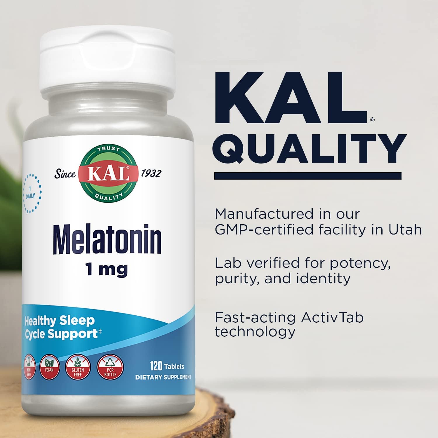 Kal Melatonin 1Mg Sleep Aid, Fast Acting Melatonin Tablets, Calming Relaxation And Sleep Cycle Support, Vegan, Gluten Free, Non-Gmo, 60-Day Guarantee, 120 Servings, 120 Tablets