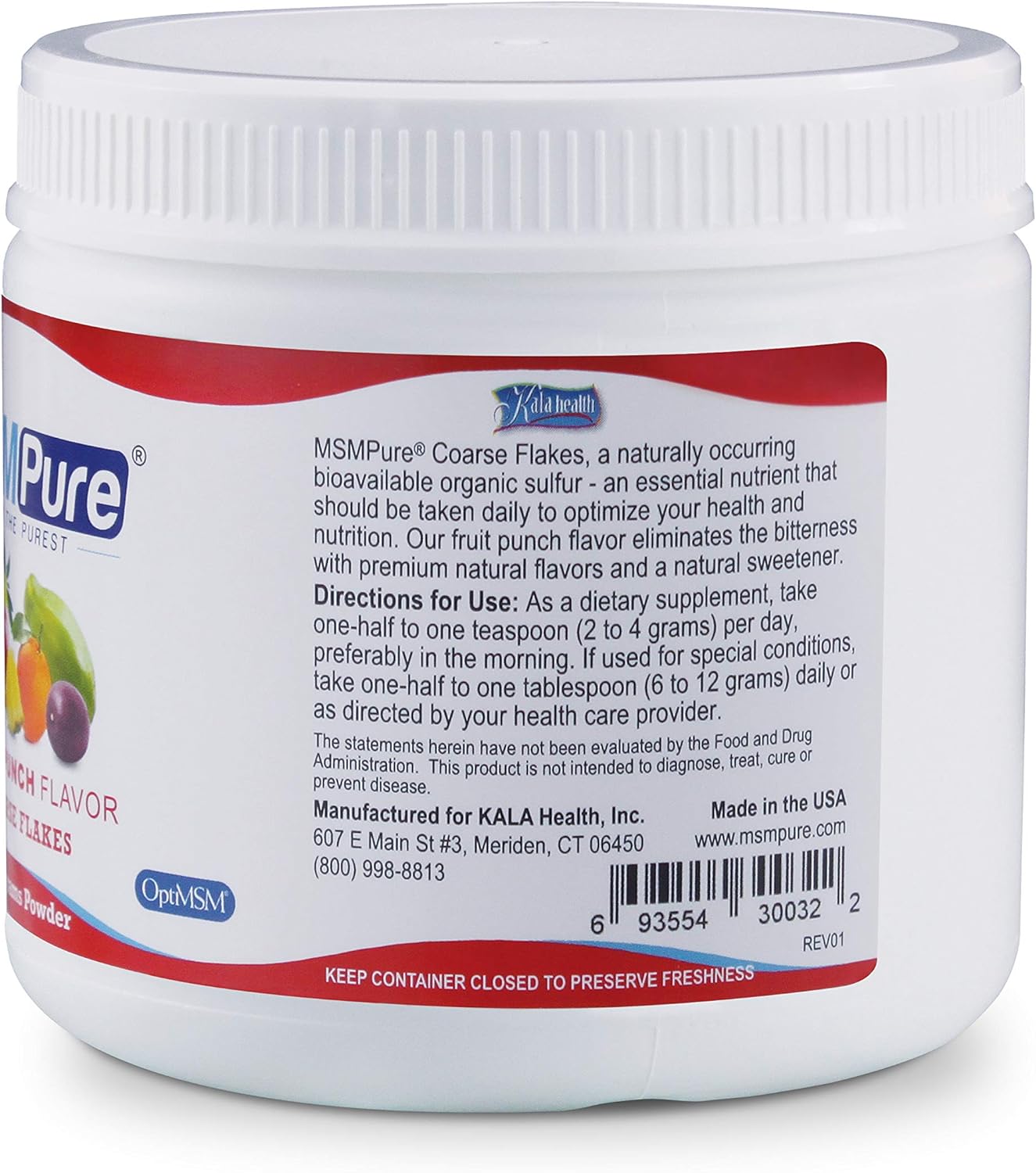 DESCRIPTION : Kala Health MSMPure Fruit Punch Flavored Coarse Powder Flakes, 8.8 oz, Organic Sulfur Crystals, 99.9% Pure Distilled MSM Supplement, Made in The USAFruit Punch8.8 Ounce (Pack of 1)