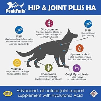 About this item Comprehensive Joint Support: Formulated with vegetarian Glucosamine, Chondroitin, OptiMSM, Ester-C, and Hyaluronic Acid to support joint mobility, comfort, and overall joint health. Supports Healthy Cartilage: Helps maintain healthy cartilage and connective tissues, promoting mobility and reducing discomfort associated with joint issues. Enhanced Mobility: Supports joint flexibility and mobility, making it an excellent choice for senior dogs or active breeds that need extra joint support. High-Quality Ingredients: Made with vegetarian glucosamine, OptiMSM, and Ester-C for better absorption and effectiveness. Manufactured in the USA for safety and efficacy. Tasty & Treat-Like Experience: Chewable tablets are tasty and convenient, providing a treat-like experience for your dog, ensuring a hassle-free supplementation routine. See more product details,Comprehensive Joint Support: Formulated with vegetarian Glucosamine, Chondroitin, OptiMSM, Ester-C, and Hyaluronic Acid to support joint mobility, comfort, and overall joint health,Supports Healthy Cartilage: Helps maintain healthy cartilage and connective tissues, promoting mobility and reducing discomfort associated with joint issues,Enhanced Mobility: Supports joint flexibility and mobility, making it an excellent choice for senior dogs or active breeds that need extra joint support,High-Quality Ingredients: Made with vegetarian glucosamine, OptiMSM, and Ester-C for better absorption and effectiveness. Manufactured in the USA for safety and efficacy,Tasty & Treat-Like Experience: Chewable tablets are tasty and convenient, providing a treat-like experience for your dog, ensuring a hassle-free supplementation routine