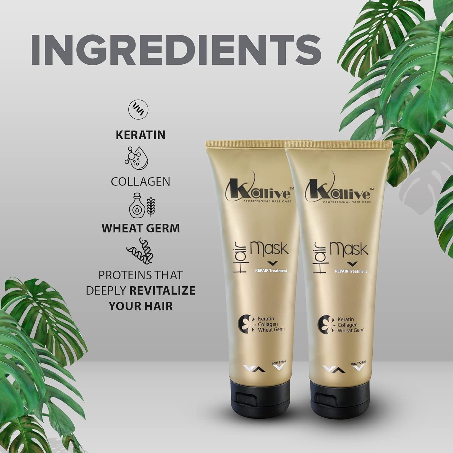 KALIVE Hair Mask for Deep Hydration & Repair - 8 oz. Keratin, Collagen & Wheat Germ - Hair Care Products for Dry, Damaged Hair. (Pack of 2)