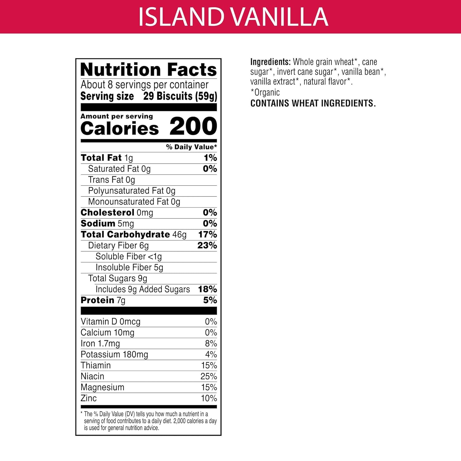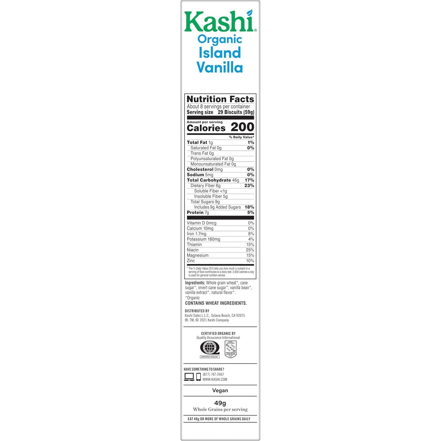 About this item Enter a calming flavor oasis with real, organic vanilla beans and whole wheat biscuits and get 49g of whole grains while you're at it Deliciously crunchy and full of sweet flavor, enjoy this breakfast cereal in the morning or any time of day Excellent source of fiber; 49g whole grains; 100% vegan; Organic; Non-GMO Project Verified; Kosher Pareve; Contains wheat ingredients Enjoy it as part of a quick breakfast or as a delicious snack; Pack in baggies for on-the-go convenience; Taste the love with this cereal meant for all ages Includes one, 16.3oz box of Kashi Island Vanilla Breakfast Cereal; Packaged for freshness and great taste  See more product details,Enter a calming flavor oasis with real, organic vanilla beans and whole wheat biscuits and get 49g of whole grains while you're at it,Deliciously crunchy and full of sweet flavor, enjoy this breakfast cereal in the morning or any time of day,Excellent source of fiber; 49g whole grains; 100% vegan; Organic; Non-GMO Project Verified; Kosher Pareve; Contains wheat ingredients,Enjoy it as part of a quick breakfast or as a delicious snack; Pack in baggies for on-the-go convenience; Taste the love with this cereal meant for all ages,Includes one, 16.3oz box of Kashi Island Vanilla Breakfast Cereal; Packaged for freshness and great taste