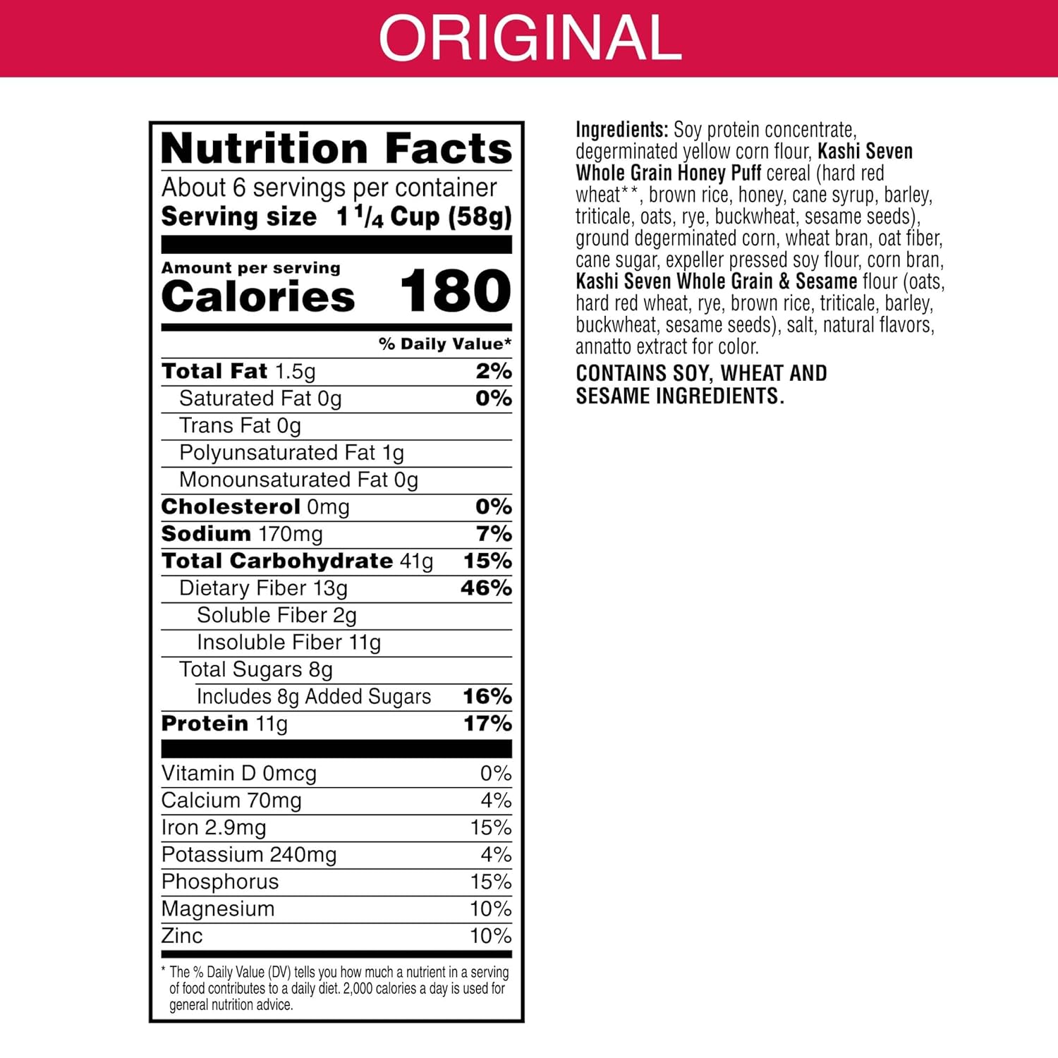 Product Description Treat yourself to the delicious taste of sweetened, honey-toasted whole grain puffs, crunchy cereal sticks, and crispy soy protein grahams in every bite of Kashi GO Original breakfast cereal. Includes 1, 13.1-ounce box of breakfast cereal. Whether itās starting the morning with a bowlful or enjoying as a midday snack, Kashi GO Original cereal delivers a sweet and satisfying crunch thatās sure to please. Non-GMO Project Verified, each wholesome serving provides 11g of protein and 12g of fiber; Kashi GO Original breakfast cereal is the perfect way to power your day. Enjoy with your favorite milk or pair with fruit or yogurt for a delicious breakfast. For a portable snack, pack reusable baggies into your purse, lunch box or gym bag. Kashi GO Original cereal also makes a great after dinner treat by the handful or as a topping on your favorite ice cream. Anytime is the right time for Kashi GO Original breakfast cereal. From the Manufacturer Kashi GOLEAN Cereal Each morning brings new opportunities to make choices that help you stay on track to being your healthiest. So start your day with Kashi GOLEAN cerealāthe perfect choice to help you achieve your healthy lifestyle goals. Just one serving supplies 35% of your daily fiber needs and 17% of your daily protein needs! All-natural GOLEAN cereal is a lightly sweetened mix of honey-toasted whole grain puffs, crispy soy protein grahams and crunchy twigs. Youāll feel great knowing that you are treating yourself right and enjoying it. Good source of protein Soy protein High in fiber Low in fat A bowl of GOLEAN cereal has as much protein as an egg** *48g or more of whole grains recommended daily. **Kashi GOLEAN cereals = 9-13 protein grams per serving; One large egg = 6 grams protein per serving Each GOLEAN product is designed with our unique combination of protein and fiber. And they also have the great taste and texture of real whole grain foods made with all natural ingredients, so you look forward to enjoying them. About Kashi We began with a healthy epiphany. Back in 1984, we discovered the goodness of whole-grain nutrition and created the unique blend of Kashi Seven Whole Grain & Sesame that adds protein and complex carbohydrates. Nearly 30 years later, we are still passionate about making the world a healthier place. The Kashi Seven Whole Grain & Sesame blend is more than the cornerstone of our product line--it is our heritage, our story and our promise to provide you with foods that are real, satisfying and sustaining. We are truly on a seven whole grains mission. We are a group of passionate people who believe that all people have the power to make positive changes in their lives. We think that good health starts with taking little steps, like choosing wholesome all-natural foods. In line with this belief, we have developed delicious breakfasts, satisfying snacks and mouth-watering dinners. Enjoy!Satisfy your taste buds with sweetened, honey-toasted whole grain puffs, crunchy cereal sticks, and crispy soy protein grahamsEnjoy it as a quick and easy breakfast or as a delicious snackA good source of protein; 18% of daily value per serving; An excellent source of fiber; Contains 2g total fat per serving; Kosher Pareve; Non-GMO Project VerifiedKashi annually measures the carbon emissions from the cooking and baking of our foods and offsets them through programs that avoid or remove greenhouse gases from the air