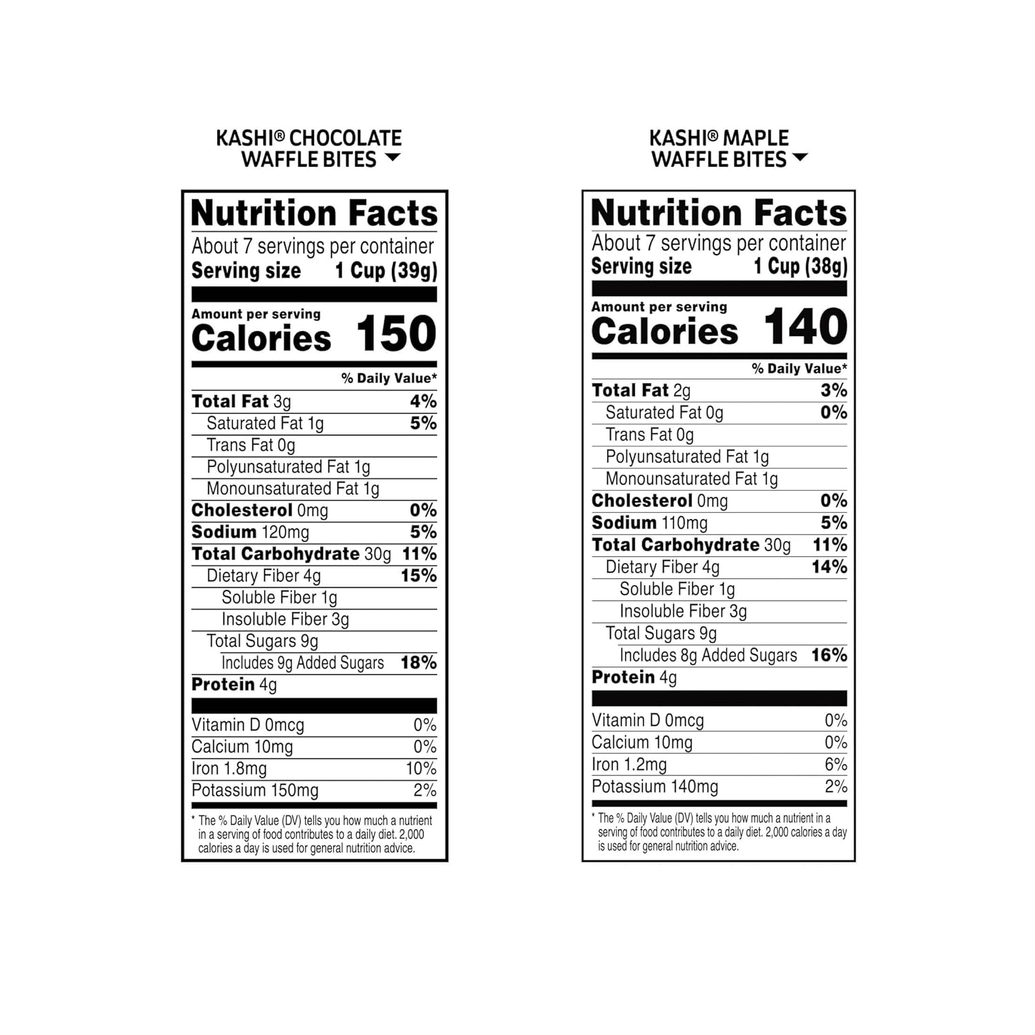Wake up and enjoy tempting flavors with a variety of Kashi breakfast cereals. This variety pack includes Kashi Maple Waffle Bites, deliciously crunchy cereal with a touch of maple syrup, and Kashi Chocolate Waffle Bites, crispy waffle cereal made with Fair Trade chocolate. With low sodium and 4g of fiber per serving, these cereals are vegan and Non-GMO Project Verified; Kashi cereal combines delicious flavors with key nutrients making it a quick and easy way to make every morning a little brighter. Kashi cereals are also a healthy choice for a snack anytime at home or on the go. Pack reusable baggies of cereal in your backpack, your car, or your desk at work for a tasty treat between meals. Whether you’re starting or ending your day, Kashi breakfast cereal is a wholesome choice for satisfying your hunger