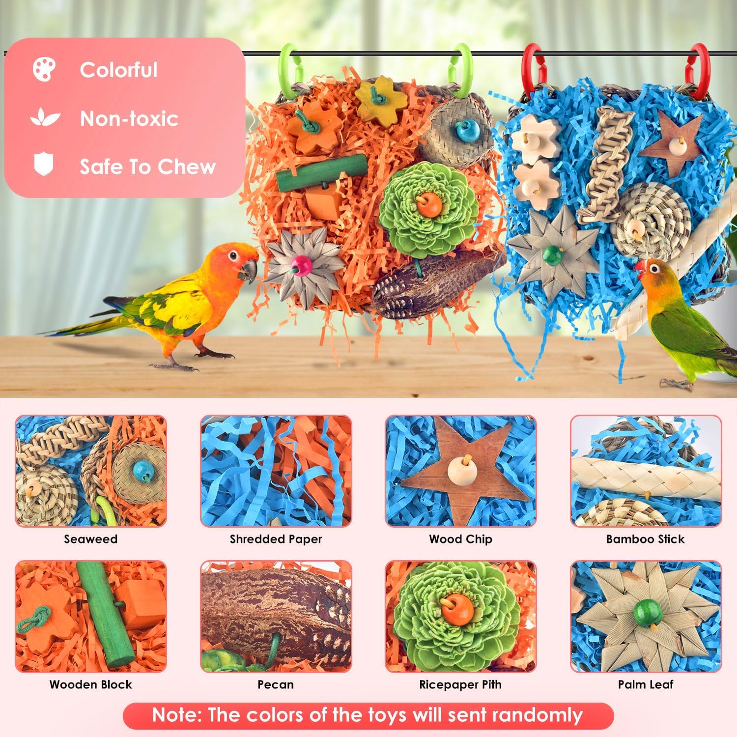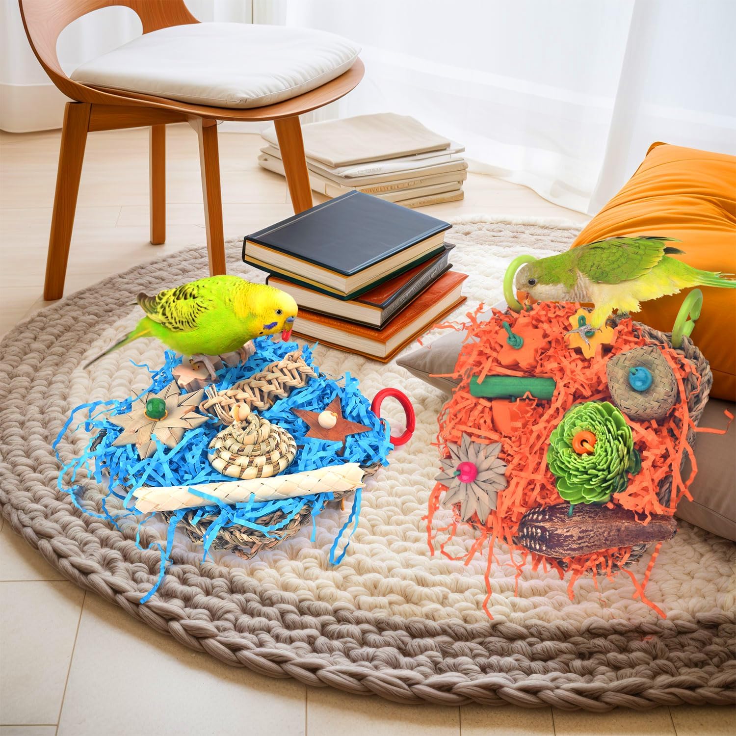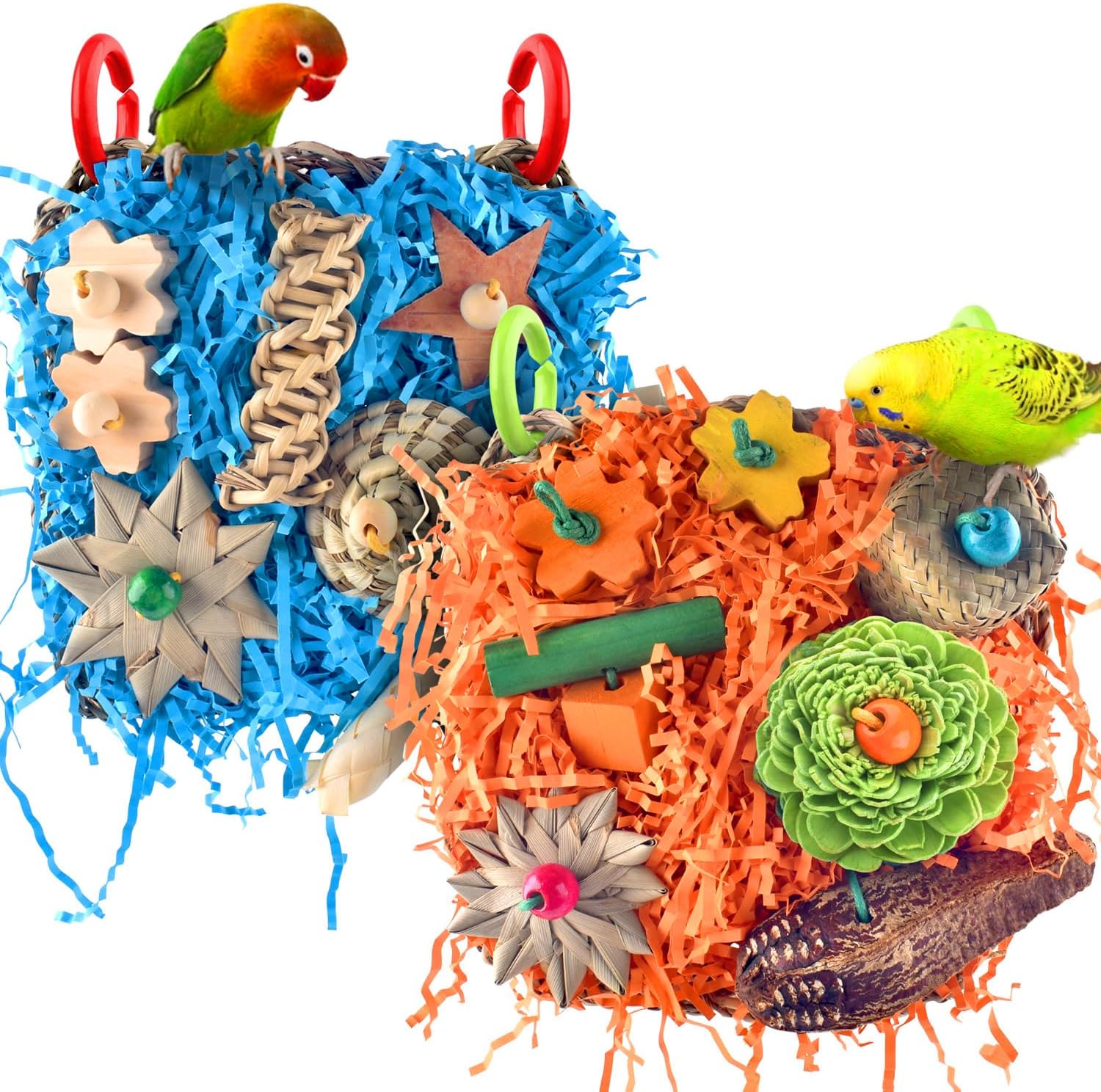 Safe Material: Katumo Bird Climbing Mat Is Made Of Natural Seagrass, Decorated With Colorful Chew Toys From Natural Wood, Bamboo Stick, Wood Chip, Shredded Paper, Ricepaper Pith, Palm Leaf And Pecan, Your Bird Will Surly Loving To Chew And Play