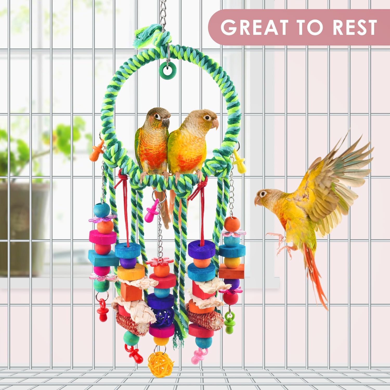 Enrichment Benefits: This Conure Perch Toy Is Designed To Not Only Grind Birdies' Beaks But Also Exercise Their Claws And Muscle. Many Parrots Enjoy The Physical Activities Of Hanging, Swinging And Spinning The Toys By Sitting On The Top Of The Swing Ring, Even Flapping Wings To Make It Spin In Circles