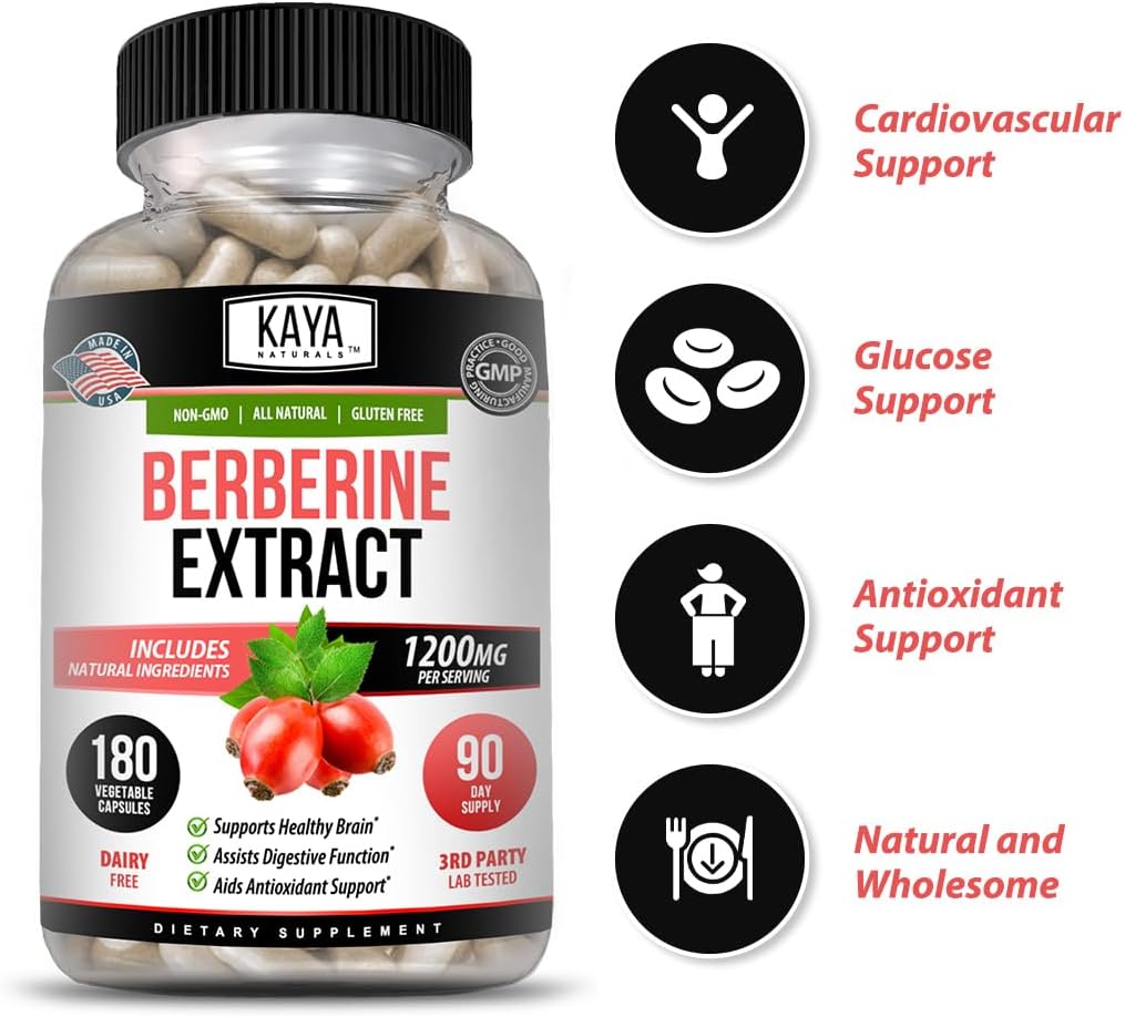 Kaya Naturals Berberine Hcl Extract 1200Mg - Supports Strong Immune System - Helps With Glucose Levels, Improve Gut Health (Vegetarian, Non-Gmo & Gluten-Free) Berberine Supplement (180 Count)