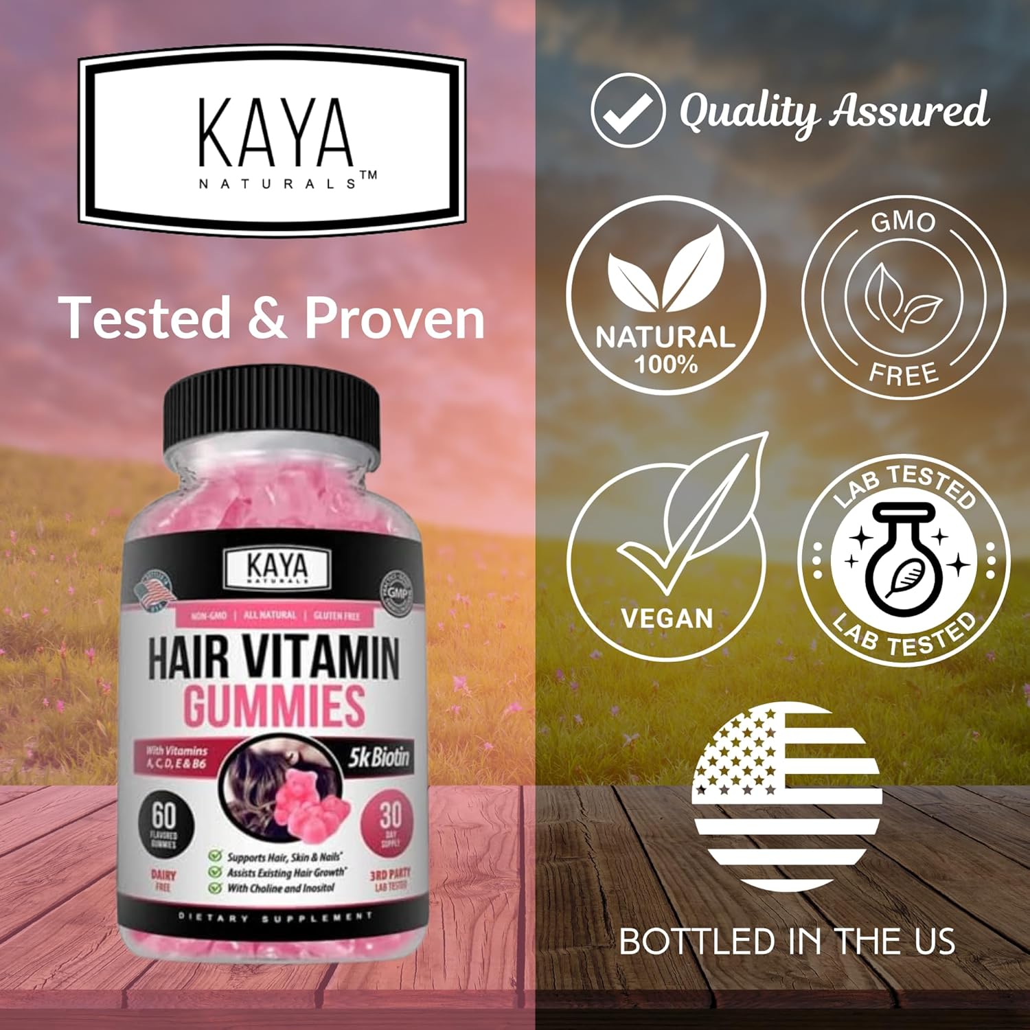 Kaya Naturals Hair Growth Gummies - Biotin 5000Mcg Vitamins For Healthy Hair, Skin, And Nails - Beauty Supplement For Women Or Men - 60 Count - Blueberry Flavor