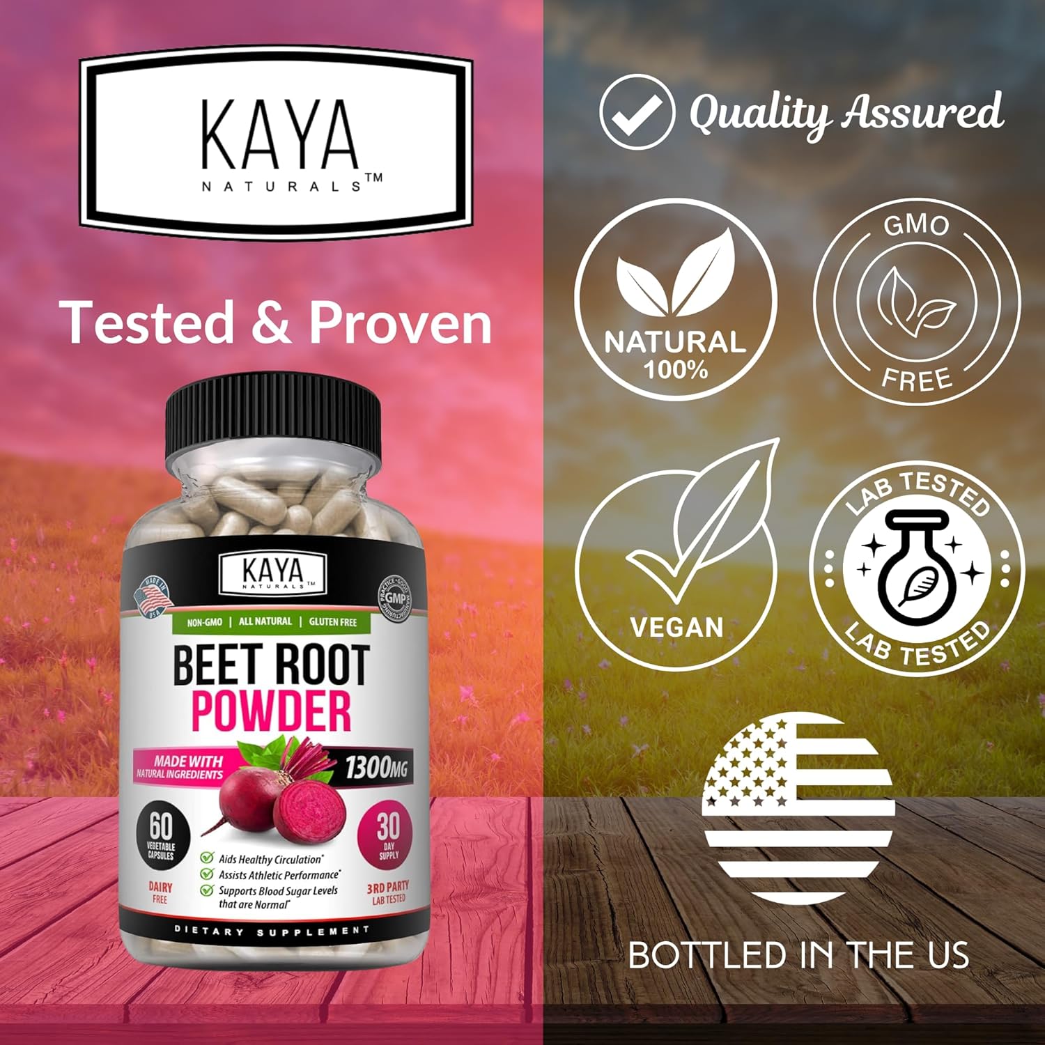 Kaya Naturals Premium Organic Beet Root Powder | Beet Root Extract, Athletic Performance Aids Healthy Circulation & Nitric Oxide Booster, Non-Gmo & Gluten-Free, 1300Mg Per Serving - 60 Veggie Capsules