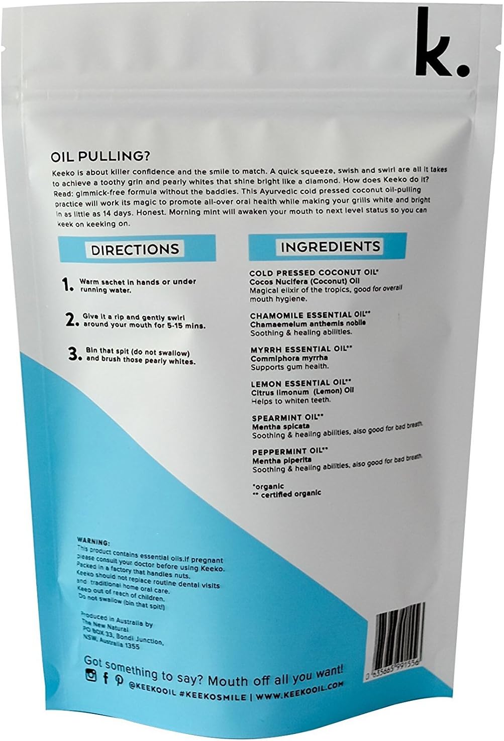 HOW TO USE: Massage sachet to warm coconut oil if it has hardened (this is normal in cold climates). Open sachet and pour contents into mouth. Gently swish and swirl around your mouth for 5 – 15 minutes. Bin that spit and brush those pearly whites. Repeat once a day for 14 days for best results