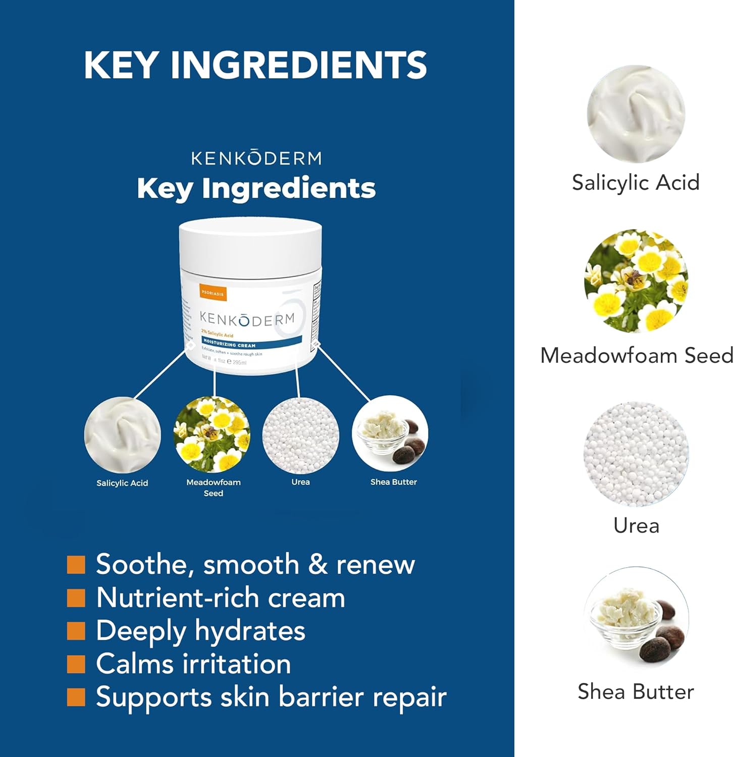 About this item Clear, Calm, Comforted Skin: Kenkoderm 2% Salicylic Acid Cream gently exfoliates and moisturizes to smooth rough patches, unclog pores, and support clearer, healthier-looking skin, enhancing your daily psoriasis, rosacea, or eczema skincare routine Soothe, Smooth, & Renew: This nutrient-rich cream is powered by Shea Butter and Meadowfoam Seed Oil to deeply hydrate, calm irritation, and support skin barrier repair—restoring comfort, balance, and a healthy, natural glow Gentle Fragrance + Color-Free Defense: This gentle moisturizer contains no artificial fragrances or dyes and works best when used 1-4 times daily, specifically after showering, to minimize irritation and support sensitive skincare needs at any age Dermatologist Developed in the USA: Developed by a dermatologist for flaky, scaly, or sensitive skin, this non-greasy cream absorbs easily to provide gentle support for men and women seeking comfort in their everyday skincare regimen Sensitive Skincare Solutions: Pair with Kenkoderm Mineral Salt Soap, Dead Sea Mud Soap, Shampoo, Conditioner, and Multivitamin to support immune health and healthy skin with vegan, cruelty-free solutions  See more product details,Clear, Calm, Comforted Skin: Kenkoderm 2% Salicylic Acid Cream gently exfoliates and moisturizes to smooth rough patches, unclog pores, and support clearer, healthier-looking skin, enhancing your daily psoriasis, rosacea, or eczema skincare routine,Soothe, Smooth, & Renew: This nutrient-rich cream is powered by Shea Butter and Meadowfoam Seed Oil to deeply hydrate, calm irritation, and support skin barrier repair—restoring comfort, balance, and a healthy, natural glow,Gentle Fragrance + Color-Free Defense: This gentle moisturizer contains no artificial fragrances or dyes and works best when used 1-4 times daily, specifically after showering, to minimize irritation and support sensitive skincare needs at any age,Dermatologist Developed in the USA: Developed by a dermatologist for flaky, scaly, or sensitive skin, this non-greasy cream absorbs easily to provide gentle support for men and women seeking comfort in their everyday skincare regimen,Sensitive Skincare Solutions: Pair with Kenkoderm Mineral Salt Soap, Dead Sea Mud Soap, Shampoo, Conditioner, and Multivitamin to support immune health and healthy skin with vegan, cruelty-free solutions