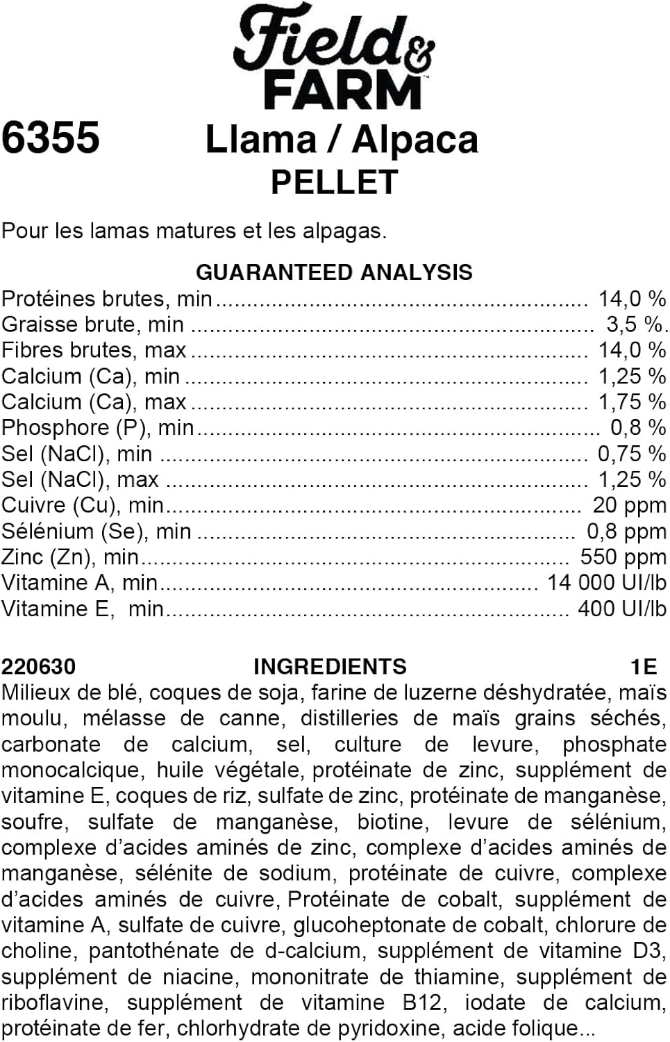 FIELD AND FARM LlAMA AND ALPACA PELLETS: Field and Farm Llama and Alpaca pellets are made with optimal vitamins and nutrience for a balanced diet. Made with trusted ingredients protein to support energy levels