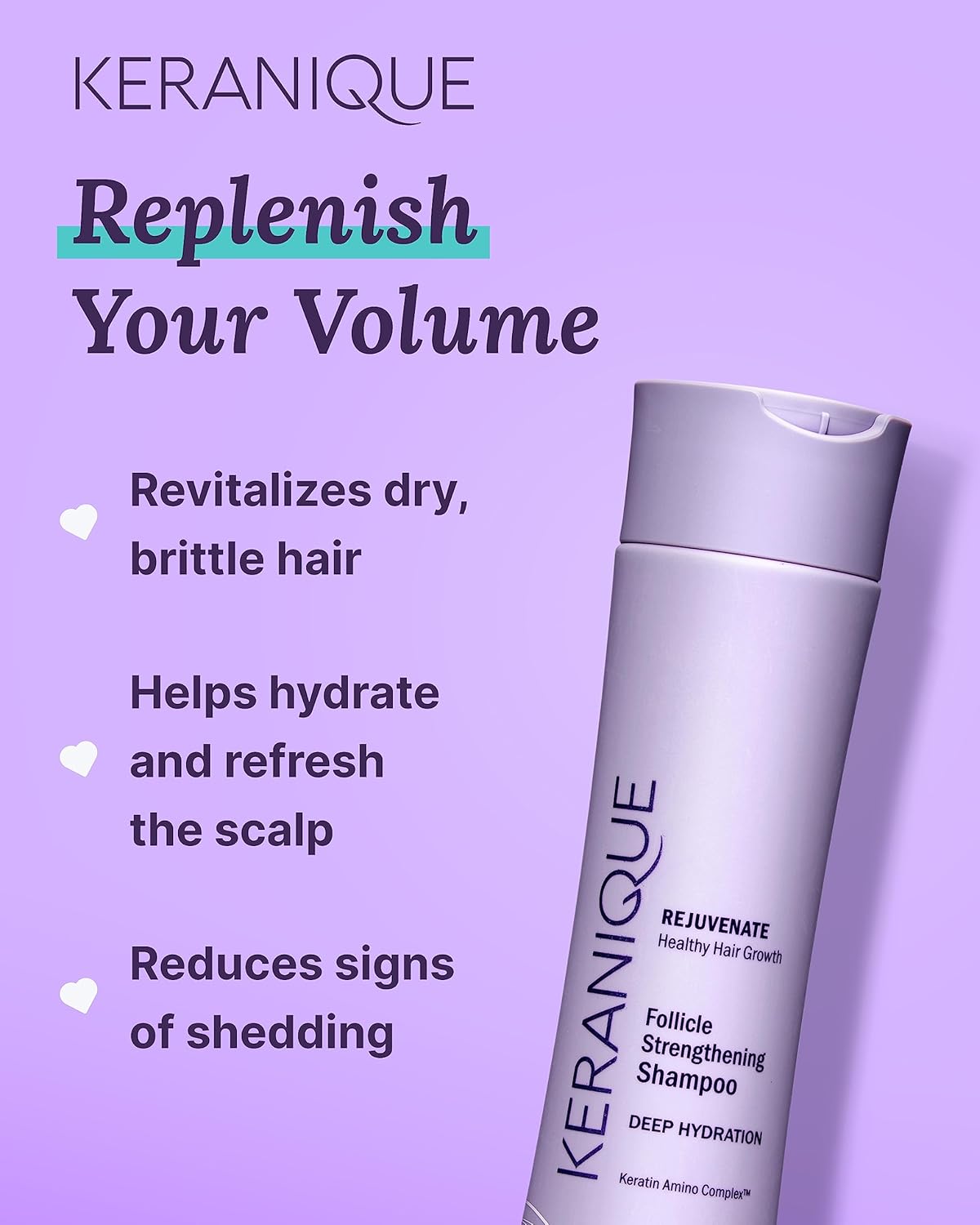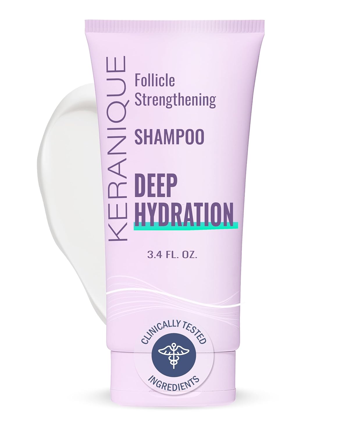 About this item REPLENISH YOUR VOLUME: Keranique Deep Hydration Shampoo is specifically formulated to revitalize and repair dry, thinning, and brittle hair, hydrate and refresh the scalp, and reduce signs of shedding - bringing back silky radiance RESTORE SOFTNESS & VITAL MOISTURE: Our non-residue moisturizing and conditioning shampoo gently cleanses the scalp, replenishes moisture, and improves manageability without weighing your hair down NO-MORE DRY-OUTS FORMULA: Contains an ultimate blend of botanicals, super antioxidants, keratin proteins, and hair ultra moisturizers that nourish the scalp and hair follicles for hair that is strong, volumized, and vibrant ENRICHED WITH KERATIN: Keranique proprietary Keratin Amino Complex helps reduce hair fall due to breakage, helps strengthen and fortify thinning hair, and shields and protects against external damage LET OUR HAIR CARE BE YOUR SELF-CARE: With a trust-built user community of over 2 million women worldwide, Keranique hair products are designed to deliver life-changing solutions for hair thinning and create the foundation for fuller hair growth See more product details,REPLENISH YOUR VOLUME: Keranique Deep Hydration Shampoo is specifically formulated to revitalize and repair dry, thinning, and brittle hair, hydrate and refresh the scalp, and reduce signs of shedding - bringing back silky radiance,RESTORE SOFTNESS & VITAL MOISTURE: Our non-residue moisturizing and conditioning shampoo gently cleanses the scalp, replenishes moisture, and improves manageability without weighing your hair down,NO-MORE DRY-OUTS FORMULA: Contains an ultimate blend of botanicals, super antioxidants, keratin proteins, and hair ultra moisturizers that nourish the scalp and hair follicles for hair that is strong, volumized, and vibrant,ENRICHED WITH KERATIN: Keranique proprietary Keratin Amino Complex helps reduce hair fall due to breakage, helps strengthen and fortify thinning hair, and shields and protects against external damage,LET OUR HAIR CARE BE YOUR SELF-CARE: With a trust-built user community of over 2 million women worldwide, Keranique hair products are designed to deliver life-changing solutions for hair thinning and create the foundation for fuller hair growth