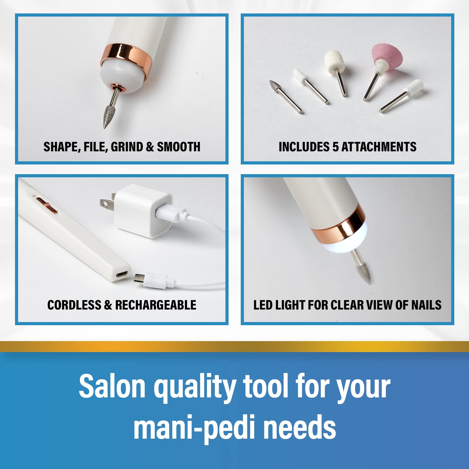 The cordless, rechargeable electric nail file comes with 5 attachments and can be used to smooth out the nail’s surface prior to applying the clear, odorless, light-weight and paraben-free nail solution