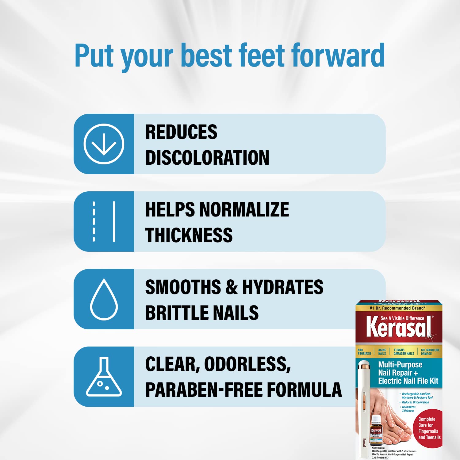 About this item Complete nail care kit: Improve the appearance of damaged fingernails and toenails with the #1 doctor recommended brand shown to provide visible results; includes one bottle of our nail repair solution and one electric nail file Multi-Purpose Nail Repair: For those unsure where their nail damage may be coming from, Multi-Purpose Nail Repair uses a single formulation to address multiple forms of damage including nail psoriasis, gel manicure damage, aging, split or cracked nails Restore to reveal healthier nails: Nail Repair deeply penetrates the nail plate to reduce discoloration, normalize thickness, smooth and hydrate the nail by combining the keratolytic properties of urea with hydrating propylene glycol and lactic acid The cordless, rechargeable electric nail file comes with 5 attachments and can be used to smooth out the nail’s surface prior to applying the clear, odorless, light-weight and paraben-free nail solution Recommended use: Apply a thin layer 2 times per day for the first week, then once per day thereafter; see packaging for full details and instructions See more product details,Complete nail care kit: Improve the appearance of damaged fingernails and toenails with the #1 doctor recommended brand shown to provide visible results; includes one bottle of our nail repair solution and one electric nail file,Multi-Purpose Nail Repair: For those unsure where their nail damage may be coming from, Multi-Purpose Nail Repair uses a single formulation to address multiple forms of damage including nail psoriasis, gel manicure damage, aging, split or cracked nails,Restore to reveal healthier nails: Nail Repair deeply penetrates the nail plate to reduce discoloration, normalize thickness, smooth and hydrate the nail by combining the keratolytic properties of urea with hydrating propylene glycol and lactic acid,The cordless, rechargeable electric nail file comes with 5 attachments and can be used to smooth out the nail’s surface prior to applying the clear, odorless, light-weight and paraben-free nail solution,Recommended use: Apply a thin layer 2 times per day for the first week, then once per day thereafter; see packaging for full details and instructions