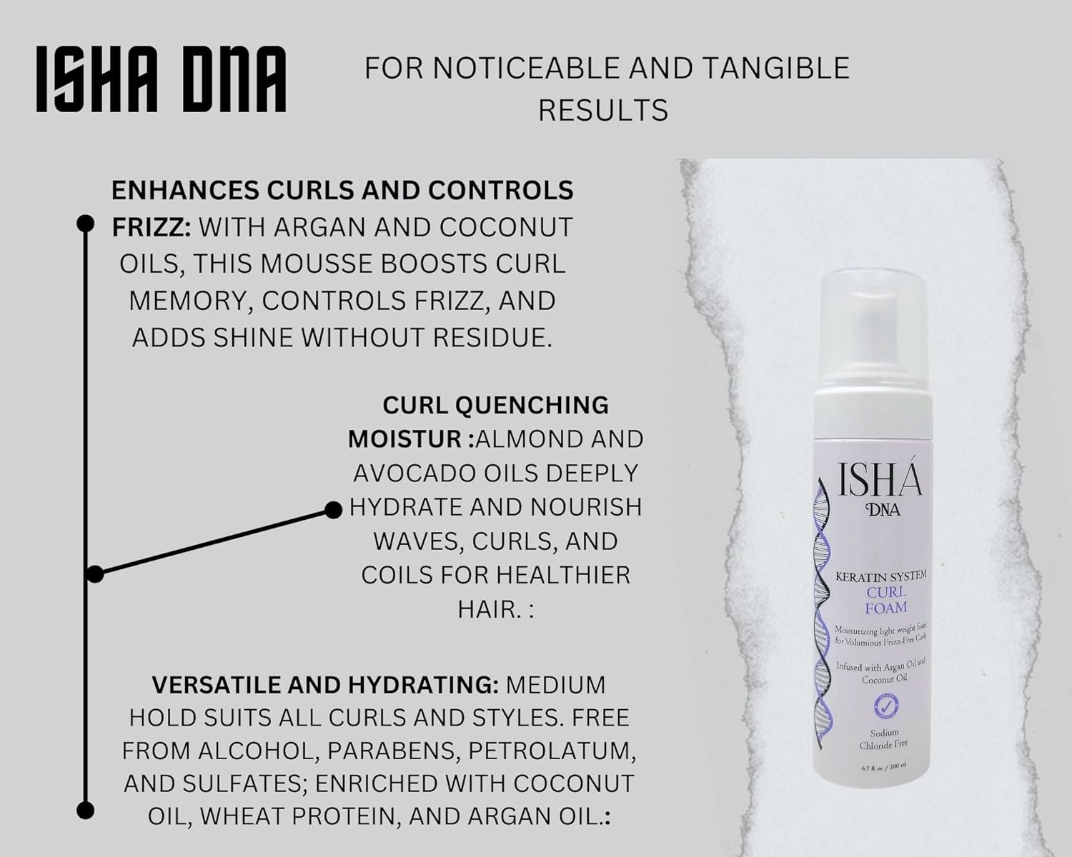 Isha Dna Keratin System Curl Hair Foam - Curl Volumizing Foam - Create Curls Or Wavy Looks With This Mousse - Frizz Free Curls - Sulfate Free - Infused With Argan Oil And Coconut Oil For Nourishment And Hydration Of Your Hair. Isha (Woman) Dna Professional Hair Care Products, Have Been Formulated And Developed With The Latest And Most Advanced Ingredients And Hair Care Technology. Isha Dna Prioritizes In Creating Products For All Types Of Hair Always Looking To Give Your Hair The Best Results And Best Hair Care. Enhances Natural Curl Memory And Wave Pattern. Infused With Argan Oil And Coconut Oil Helps Control Frizz And Nourishes The Hair. It Creates Shinny Curls With Volume Without Leaving Residues Directions: Pump A Generous Amount Into Palms Of Your Hands And Scrunch Upward Into Wet Hair And Roots. Air Dry Or Blow-Dry Using A Difusser