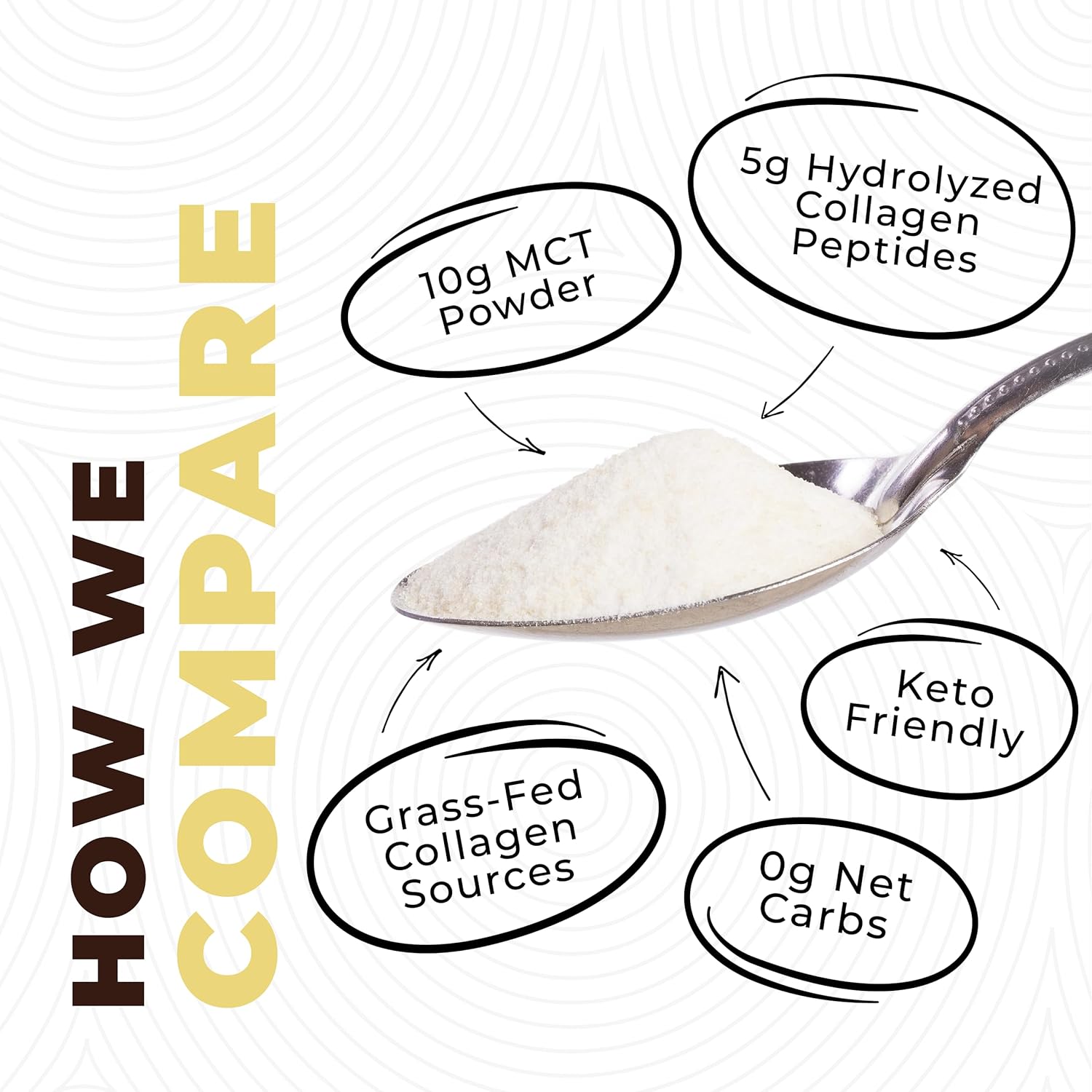 Premium Ingredients: MCT Powder (60/ 40, C8 /10) with GRASS FED COLLAGEN PEPTIDES and PREBIOTIC FIBRE - 10g of MCT Powder Oil, 5g of Collagen Peptide Powder PLUS Prebiotic Acacia Fibre with a rich vanilla taste. A must have for the Keto diet!
