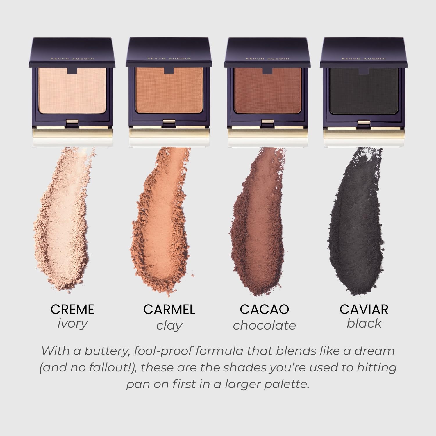 About this item Kevyn Aucoin The Individual Eyeshadow: This matte, buttery formula blends easily with minimal fallout for a fool-proof application. The Individual Eyeshadows are your makeup wardrobe staples - versatile, dependable, and timeless, like a tailored black blazer or your favorite pair of jeans. Inspired by Kevyn Aucoin’s signature shading and lighting techniques, these four ‘90s neutral shades were carefully chosen as the ultimate basics - the ones you’ll reach for every day and hit pan on fastest. AVAILABLE COLORS: Cacao (Dark Brown: Chocolate), Carmel (Warm Brown: Hint of Peach), Caviar (Black), Crème (Off White: Bone). These easy-to-use shadows can be worn alone or combined, perfect for both daily use and Pro Artistry looks. Use them for a wash of color, blending transitions, deepening the crease, or highlighting the brow bone. The application possibilities are endless, making them essential in any kit. KEY FEATURES: High pigment with intense color pay-off. Super-matte finish powders. Creamy to touch. Extremely blendable: no patchiness or mudiness. Little-to-no fall out for a fool-proof, mess-free application. New, innovative formula developed by Pro make-up artists. FORMULATED AS: VEGAN + FREE FROM: PARABENS / SULFATES / FRAGRANCE / TALC / MICA / GLUTEN. THE LEGACY: These four shades bring Kevyn Aucoin’s legacy full circle, reviving the exact tones from the original ‘Eyeshadow Single’ - once a cornerstone of the brand and much-loved Pro Artist staple. After many requests to re-release the original shadows, we’re excited for you to fall in love with these updated, innovative formulas in extremely similar shades. Fun Fact: the ‘Caviar, Black’ shade is one of the darkest, most true tone black pigments available on the market! PACKAGING DETAILS: One Kevyn Aucoin Individual Eyeshadow (0.3g / POIDS NET WT. 0.010 OZ) packaged in a white Kevyn Aucoin branded poly bubble mailer. We bubble the interior of this specific packaging to protect and keep our Kevyn Aucoin products in a perfect and giftable condition during the order fulfillment process. Water-resistant and tear-proof, this packaging is tamper-evident when received.  See more product details,Kevyn Aucoin The Individual Eyeshadow: This matte, buttery formula blends easily with minimal fallout for a fool-proof application. The Individual Eyeshadows are your makeup wardrobe staples - versatile, dependable, and timeless, like a tailored black blazer or your favorite pair of jeans. Inspired by Kevyn Aucoin’s signature shading and lighting techniques, these four ‘90s neutral shades were carefully chosen as the ultimate basics - the ones you’ll reach for every day and hit pan on fastest,AVAILABLE COLORS: Cacao (Dark Brown: Chocolate), Carmel (Warm Brown: Hint of Peach), Caviar (Black), Crème (Off White: Bone). These easy-to-use shadows can be worn alone or combined, perfect for both daily use and Pro Artistry looks. Use them for a wash of color, blending transitions, deepening the crease, or highlighting the brow bone. The application possibilities are endless, making them essential in any kit,KEY FEATURES: High pigment with intense color pay-off. Super-matte finish powders. Creamy to touch. Extremely blendable: no patchiness or mudiness. Little-to-no fall out for a fool-proof, mess-free application. New, innovative formula developed by Pro make-up artists. FORMULATED AS: VEGAN + FREE FROM: PARABENS / SULFATES / FRAGRANCE / TALC / MICA / GLUTEN,THE LEGACY: These four shades bring Kevyn Aucoin’s legacy full circle, reviving the exact tones from the original ‘Eyeshadow Single’ - once a cornerstone of the brand and much-loved Pro Artist staple. After many requests to re-release the original shadows, we’re excited for you to fall in love with these updated, innovative formulas in extremely similar shades. Fun Fact: the ‘Caviar, Black’ shade is one of the darkest, most true tone black pigments available on the market!,PACKAGING DETAILS: One Kevyn Aucoin Individual Eyeshadow (0.3g / POIDS NET WT. 0.010 OZ) packaged in a white Kevyn Aucoin branded poly bubble mailer. We bubble the interior of this specific packaging to protect and keep our Kevyn Aucoin products in a perfect and giftable condition during the order fulfillment process. Water-resistant and tear-proof, this packaging is tamper-evident when received