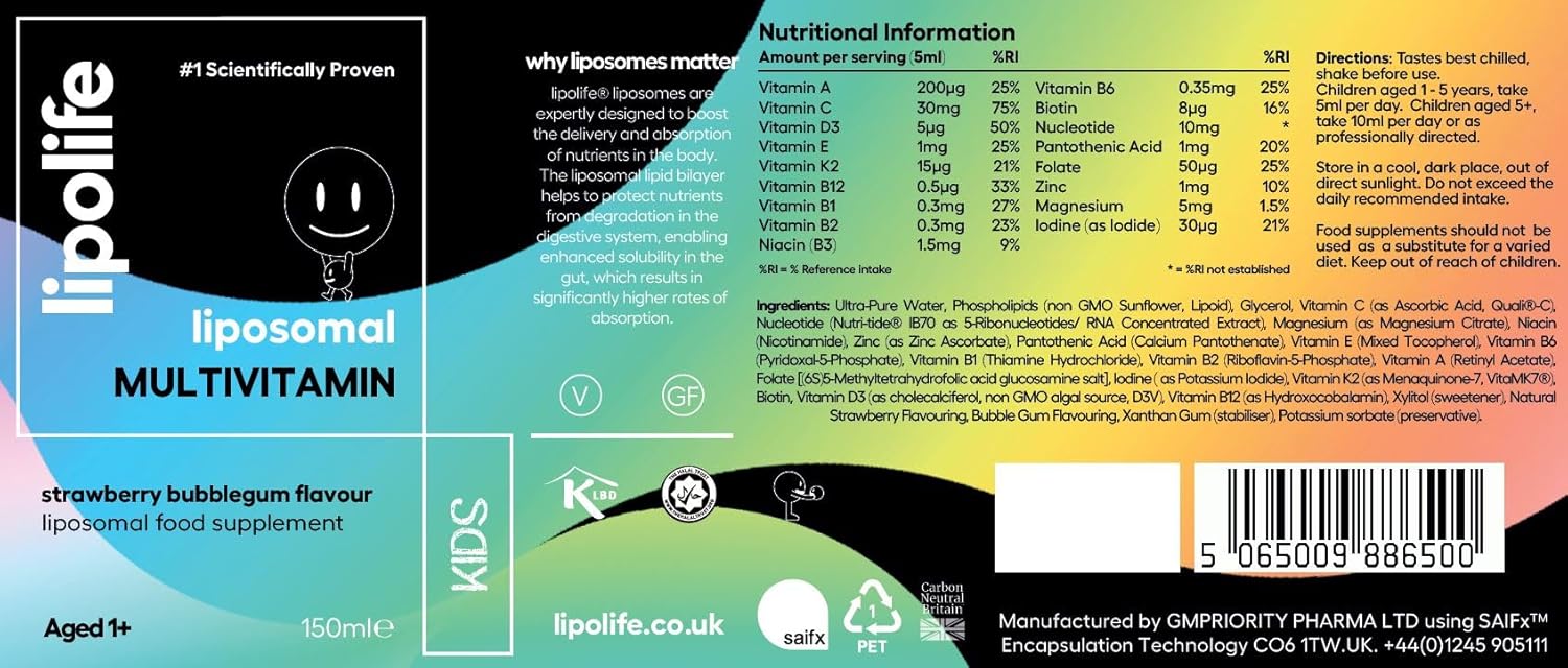 Kids Liposomal Multivitamin - Strawberry Bubblegum Flavour - Lipolife. Comprehensive Multivitamin And Mineral Liquid Supplement For Ages 1+. 30 Servings