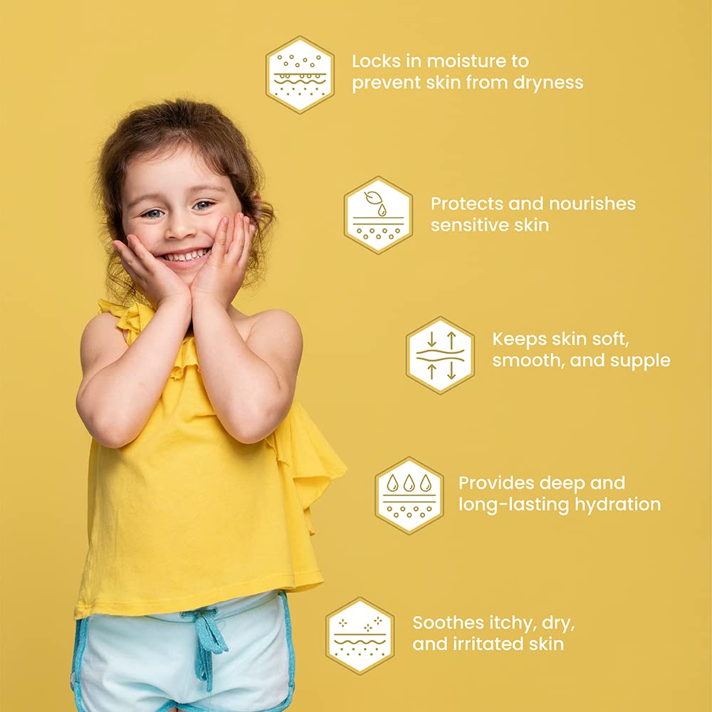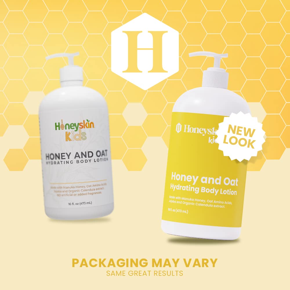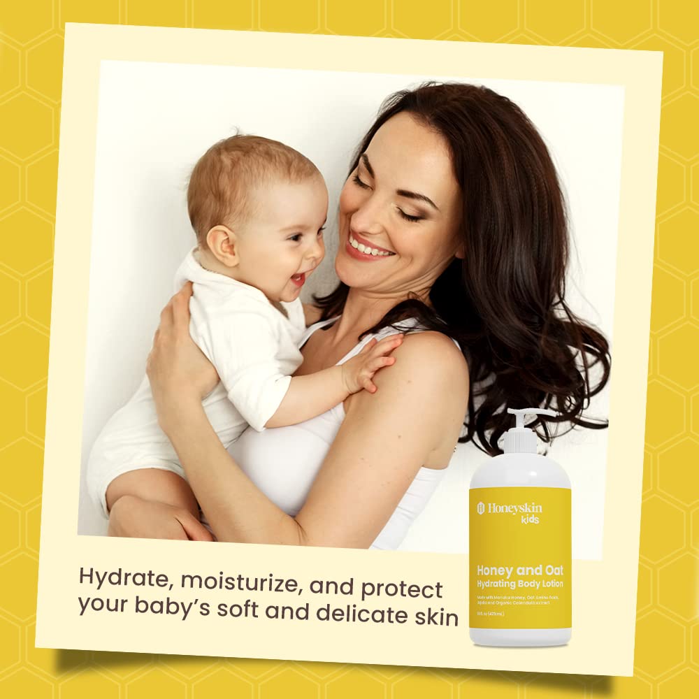 HYDRATE, SOOTHE, & REPLENISH - Honeyskin Kids & Baby Lotion not only hydrates but also delivers soothing & nutrient-enriched relief from dry, itchy skin, eczema, dermatitis, psoriasis, ocassional redness, & more! This kids & baby body lotion & moisturizer face cream replenishes rejuvenating moisture, strengthening skin's protective barrier10NOURISH, MOISTURIZE, & PROTECT - Our gentle & nourishing kids lotion & baby moisturizer provides deep & long-lasting moisturization, keeping sensitive skin soft, soothed, balanced, & healthy. This organic baby lotion & skin moisturizer locks moisture within to protect & prevent delicate skin from chapping, cracking, dryness, & irritation10NATURALLY-DERIVED INGREDIENTS - Unlike ordinary baby care products, this organic baby lotion for newborn & skin care for kids is formulated with natural & organic ingredients to keep skin nourished, smooth, & supple. Our honey lotion & body moisturizer contains Aloe Vera, Manuka Honey, Oat Amino Acids, Jojoba Oil, Calendula, & Sunflower Seed Oil10FORMULATED FOR SENSITIVE SKIN - This lightweight & non-greasy kids skin care & baby moisturizer is natural, ultra-moisturizing, & hypoallergenic, making it safe & suitable for sensitive skin. Great for babies & kids of all ages. This baby body lotion is FREE of parabens & sulfates. Cruelty-free & has been rigorously tested under dermatological control10MADE IN THE USA, RESPONSIBLY SOURCED - Honeyskin Kids Honey & Oat Hydrating Lotion is made & packed in our facilities, where stringent quality controls ensure the utmost safety & efficacy for your little one. Responsibly sourced as we strive to make a positive impact on the planet, creating a more favorable environment for your little ones to thrive