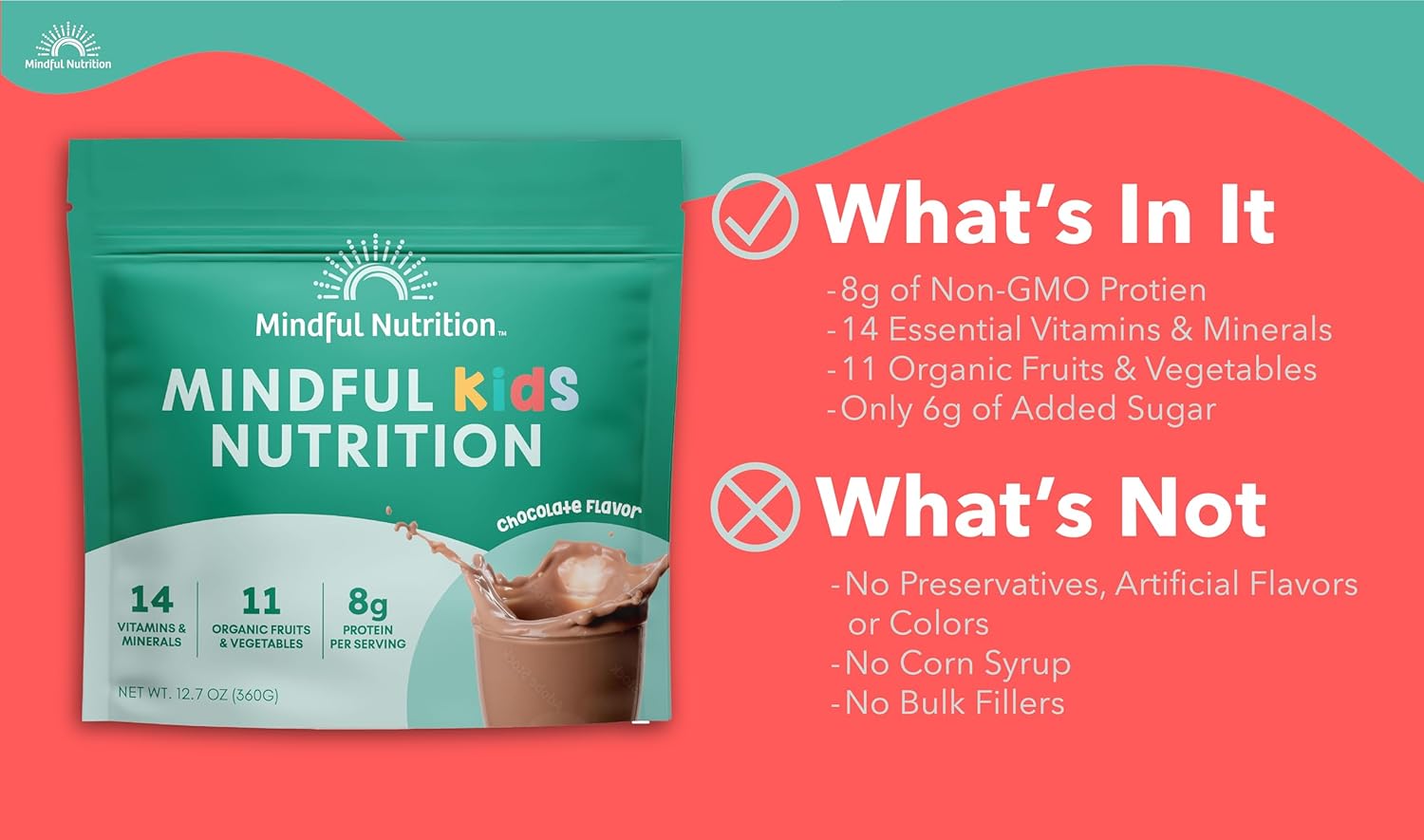About this item Perfect For After School Snacks: Our nutritious milk chocolate kids protein shake mixes are packed with 14 vitamins and minerals, 11 organic superfoods, 8g of dairy protein and only 6g of added sugar Immune Boost: Mix Mindful Kids Nutrition formula with water or milk for delicious kids protein drinks with organic greens blend superfood, vitamin C, vitamin D & Zinc for immunity support Nutrition For Kids Only Works If They'll Eat It: So we focus on creating a rich chocolate milk taste using organic cocoa powder, Non-GMO protein powder, multivitamin blend, organic vegetables & fruit Our kids protein shakes were developed for picky eaters who need high protein snacks with organic fruits and organic veggies to ensure they get proper nutrition and not empty calories and fillers The convenient resealable bag and scoop make are ideal for a fast addition to breakfast, lunch, dinner, kids snacks for school, kids lunch, before and after sports or a better for kids dessert option › See more product details,Perfect For After School Snacks: Our nutritious milk chocolate kids protein shake mixes are packed with 14 vitamins and minerals, 11 organic superfoods, 8g of dairy protein and only 6g of added sugar,Immune Boost: Mix Mindful Kids Nutrition formula with water or milk for delicious kids protein drinks with organic greens blend superfood, vitamin C, vitamin D & Zinc for immunity support,Nutrition For Kids Only Works If They'll Eat It: So we focus on creating a rich chocolate milk taste using organic cocoa powder, Non-GMO protein powder, multivitamin blend, organic vegetables & fruit,Our kids protein shakes were developed for picky eaters who need high protein snacks with organic fruits and organic veggies to ensure they get proper nutrition and not empty calories and fillers,The convenient resealable bag and scoop make are ideal for a fast addition to breakfast, lunch, dinner, kids snacks for school, kids lunch, before and after sports or a better for kids dessert option