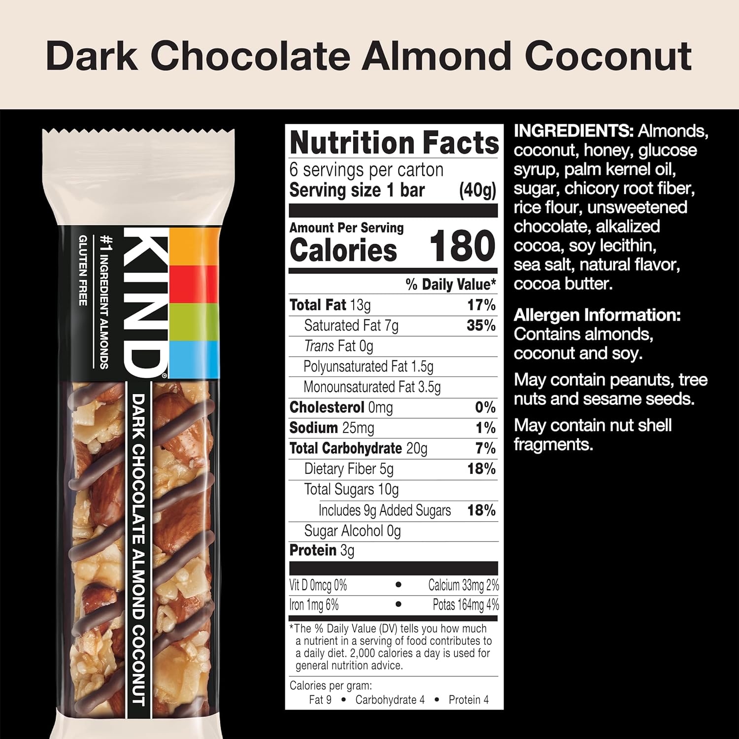 Kind Dark Chocolate Almond Coconut Bars Are Satisfying Gluten Free Bars Packed With Nuts And The Taste Of Dark Chocolate That You Can Take Anywhere. These Kind Nut Bars Lead With Almonds As The First Ingredient. This Snack Combines Quality Ingredients Like Almonds, Coconut And Dark Chocolate To Deliver A Delicious Taste With A Little Crunch, Packed As Individually Wrapped Bars For A Convenient Option That Makes Eating On-The-Go Easier. It'S The Perfect Nutrient-Dense Pick-Me-Up When Life Gets In The Way. These Dairy Free Bars Have A Low Glycemic Index, 3 Grams Of Protein, And Are A Good Source Of Fiber (Contains 13G Of Fat Per Bar). They Are Also Gluten Free And Are Made Without Genetically Engineered Ingredients