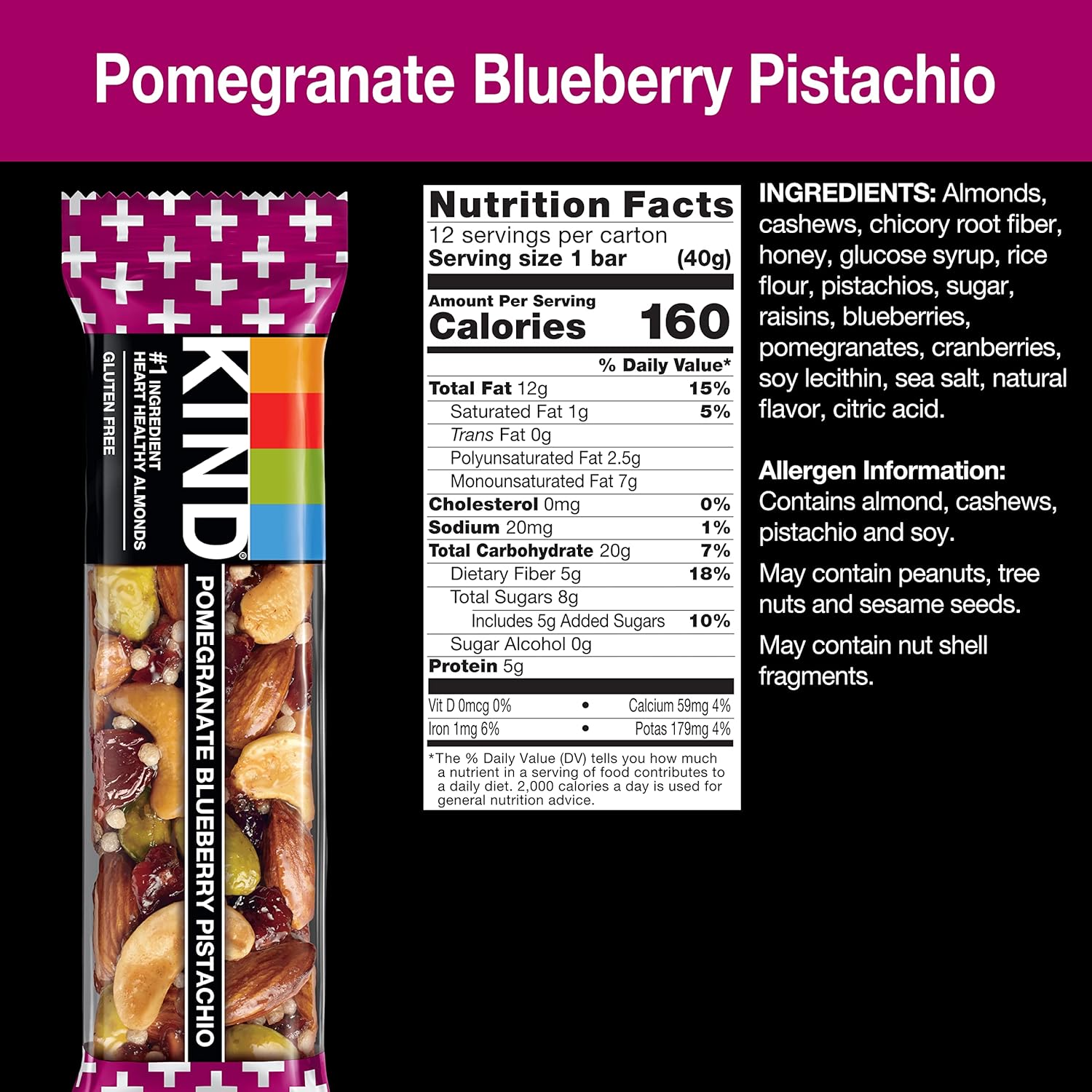 Product Description Kind Pomegranate Blueberry Pistachio Bars Are Satisfying Gluten Free Bars Packed With Nuts And Pomegranates That You Can Take Anywhere. These Kind Nut Bars Lead With Heart Healthy Almonds As The #1 Ingredient. This Healthy Snack Bar Combines Quality Ingredients Like Almonds, Pistachios, Blueberries And Pomegranate To Deliver A Delicious Taste With A Little Crunch. These Snack Bars Come Packed As Individually Wrapped Snacks For A Convenient Option That Makes Eating Healthy Easier. It'S The Perfect Nutrient-Dense Pick-Me-Up When Life Gets In The Way. Kind Bars Pomegranate Blueberry Pistachio Contain 5 Grams Of Protein And Are A Good Source Of Fiber*. This Kind Nut Bar Is Also Gluten Free, Has A Low Glycemic Index, And Is Made Without Genetically Engineered Ingredients. *Contains 12G Of Fat Per Bar Amazon.Com
