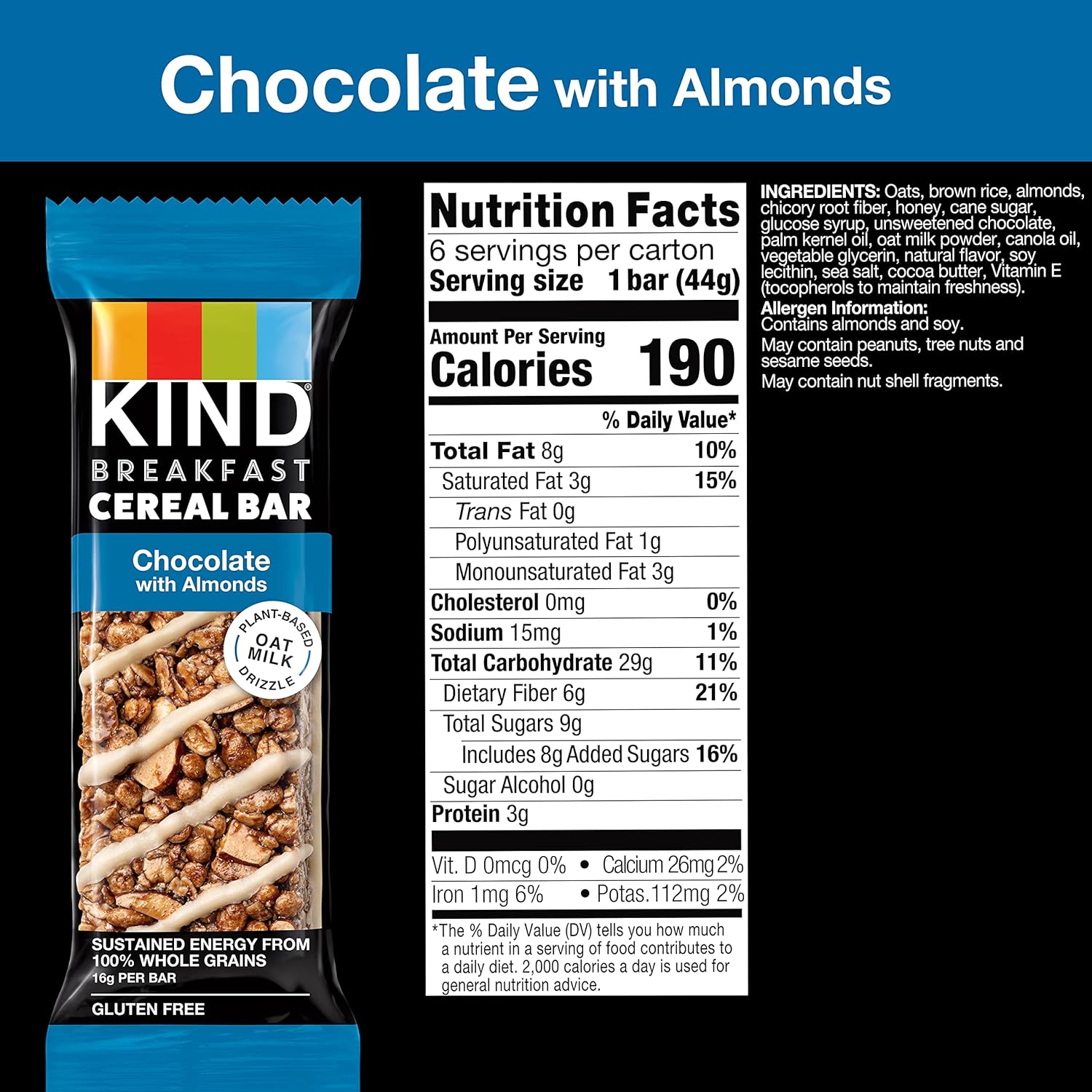 Delight Your Taste Buds With Every Bite Of Kind Breakfast Cereal Bars. Includes Six, 9.3-Ounce Boxes Of Six Individually Wrapped Snacks With Scrumptious Chocolate Taste In Every Crispy, Light Bite. Topped With A Tasty Plant-Based Oat Milk Drizzle. Start Your Day With Sustained Energy From 100% Whole Grains (16G Per Bar). Plus, The Goodness Of Being Gluten Free, Low Sodium, A Good Source Of Fiber (8G Fat Per Bar) And 0G Trans-Fat. Enjoy On-The-Go As Part Of A Balanced Breakfast. Beyond Busy Mornings, These Travel-Ready Bars Make Great Office, School, Or Lunch Box Snacks. Reach For A Kind Breakfast Cereal Bar As A Pre Workout Bar. Stash Some In Your Work Desk Or Pantry For A Convenient Bite. For Morning Or Any Time, Kind Breakfast Cereal Bars Are The Perfectly Convenient Go-To