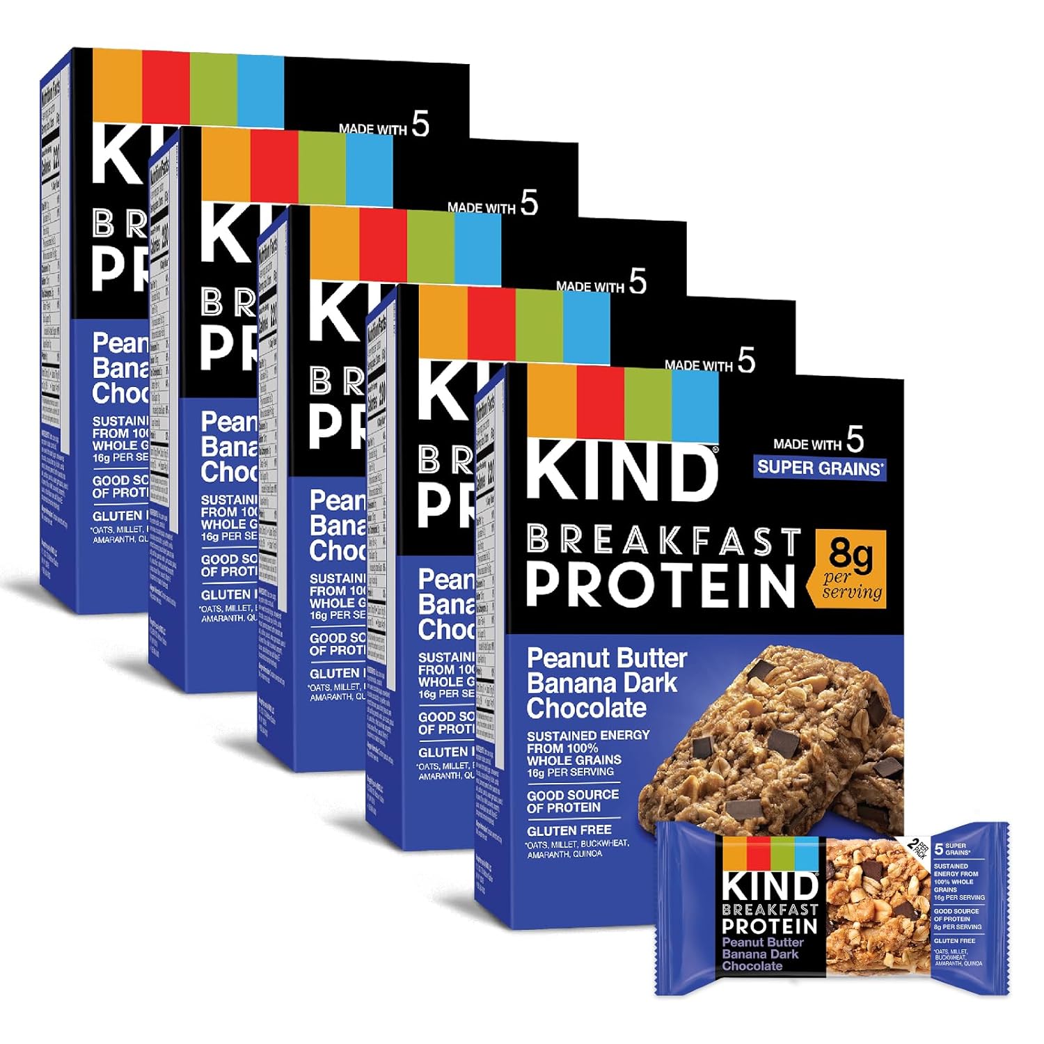 Kind Breakfast Peanut Butter Banana Dark Chocolate Protein Bars Are A Wholesome, Healthy Snack Made With 100% Whole Grains For Sustained Energy. Kind Peanut Butter Banana Dark Chocolate Breakfast Protein Bars Are Made With Five Super GrainsāOats, Buckwheat, Millet, Amaranth And QuinoaāAnd Baked With The Taste Of Dark Chocolate, Banana And Peanut Butter For A Chewy, Soft Baked Addition To Your Breakfast. These Kind Bars Come In Individually Wrapped Two Bar Packs That Are Perfect For Convenient, On-The-Go Gluten Free Snacks. Each Two Bar Pack Has At Least One Full Serving Of Whole Grains. Kind Breakfast Protein Bars Help Provide Sustained Energy Whether You Need A Nutritious Snack For Your Lunchbox Or Nutrition Bars To Grab On Your Way Out The Door. Made With Quality, Wholesome Ingredients, These Gluten Free Breakfast Bars Contain 16 Grams Of Whole Grains Per Serving. These Healthy Snacks Are Also Dairy Free And Made Without Genetically Engineered Ingredients