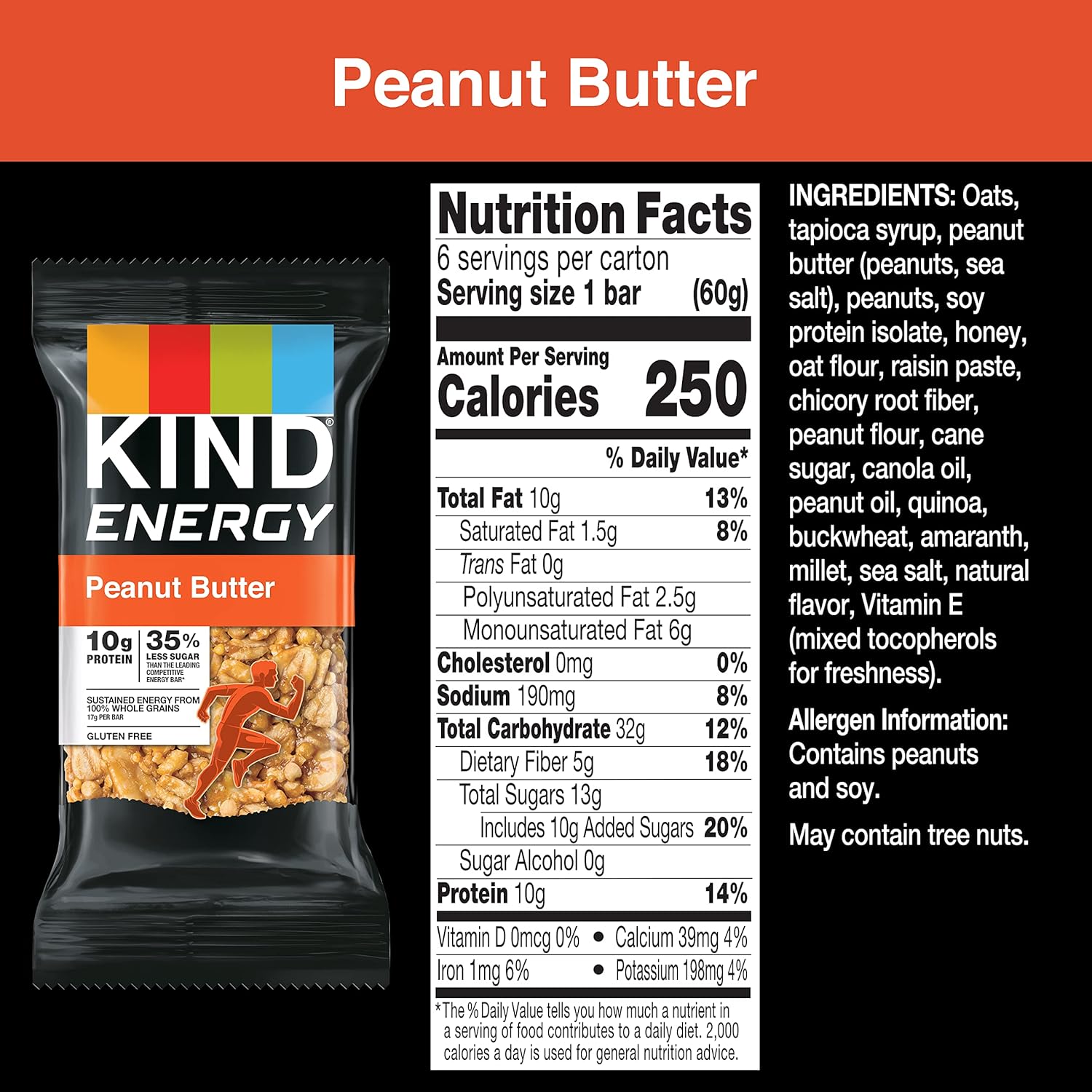Kind Energy Peanut Butter Bars Are Delicious Snacks That Help Provide Sustained Energy From 17 Grams Of Whole Grains. These Kind Energy Bars Contain 100% Whole Grains - Oats, Quinoa, Buckwheat, Amaranth, And Millet- With Oats As The #1 Ingredient. Creamy Peanut Butter And Crunchy Whole Peanuts Combine To Deliver Gluten Free Snacks With A Soft, Chewy Texture. Grab These Individually Wrapped Snacks To Fuel Your Everyday Adventures. This Grains Bar Has *35% Less Sugar Than The Leading Competitive Energy Bar, And Contains 17 Grams Of Whole Grains And 10 Grams Of Protein. With Wholesome Ingredients And No Artificial Sweeteners, Kind Energy Bars Are A Snack You Can Feel Good About. *The Leading Competitive Energy Bar Has 21G Of Sugar In A 68G Bar, Kind Energy Has 13G Of Sugar In A 60G Bar