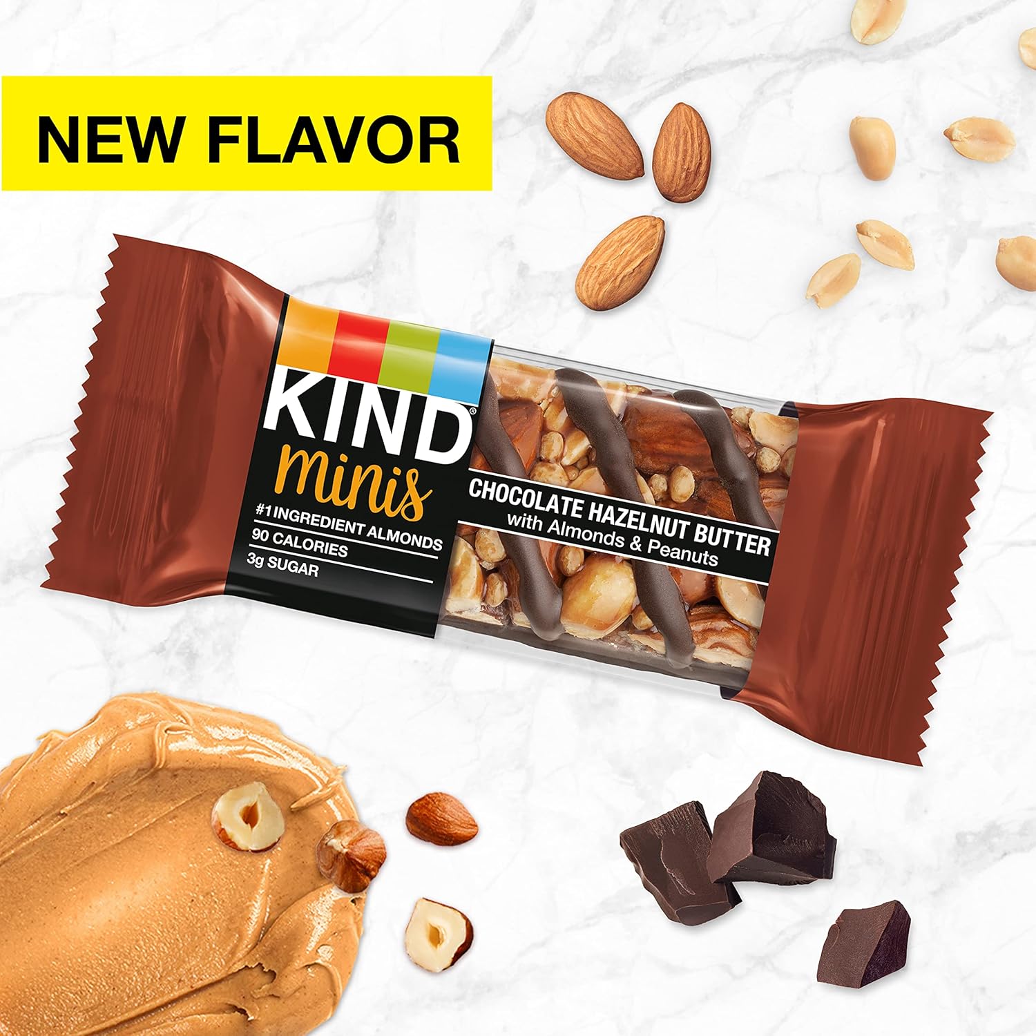 Contains ten 0.7 oz KIND Minis Hazelnut Butter with Almonds & Peanuts Bars