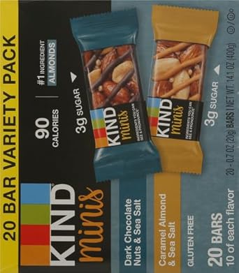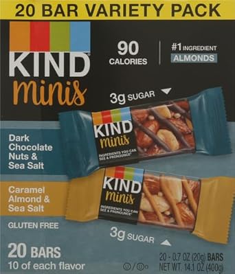 Contains (20) 0.7 Oz Kind Minis, Dark Chocolate Nuts & Sea Salt/ Caramel Almond & Sea Salt