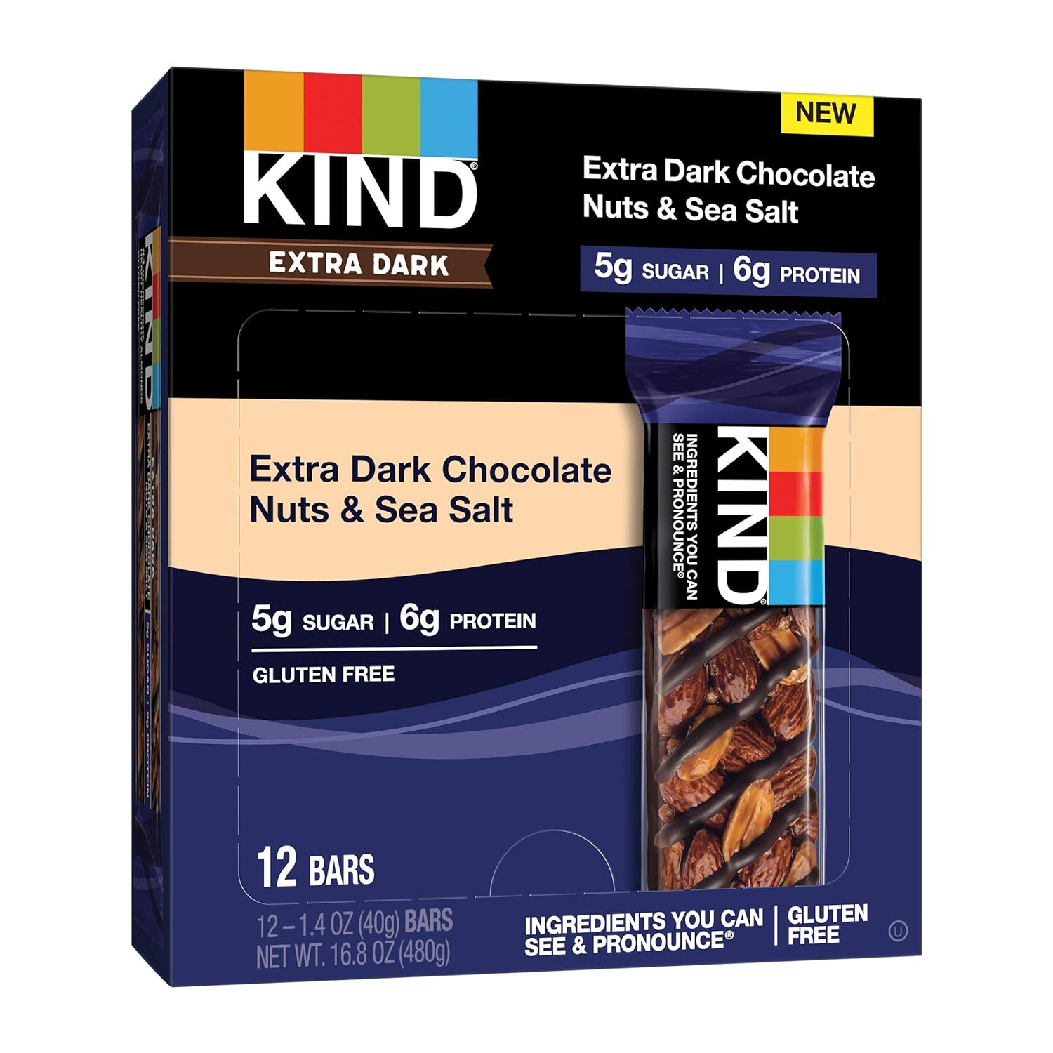 Contains 12 - 1.4oz Extra Dark Chocolate Nuts & Sea Salt KIND Bars