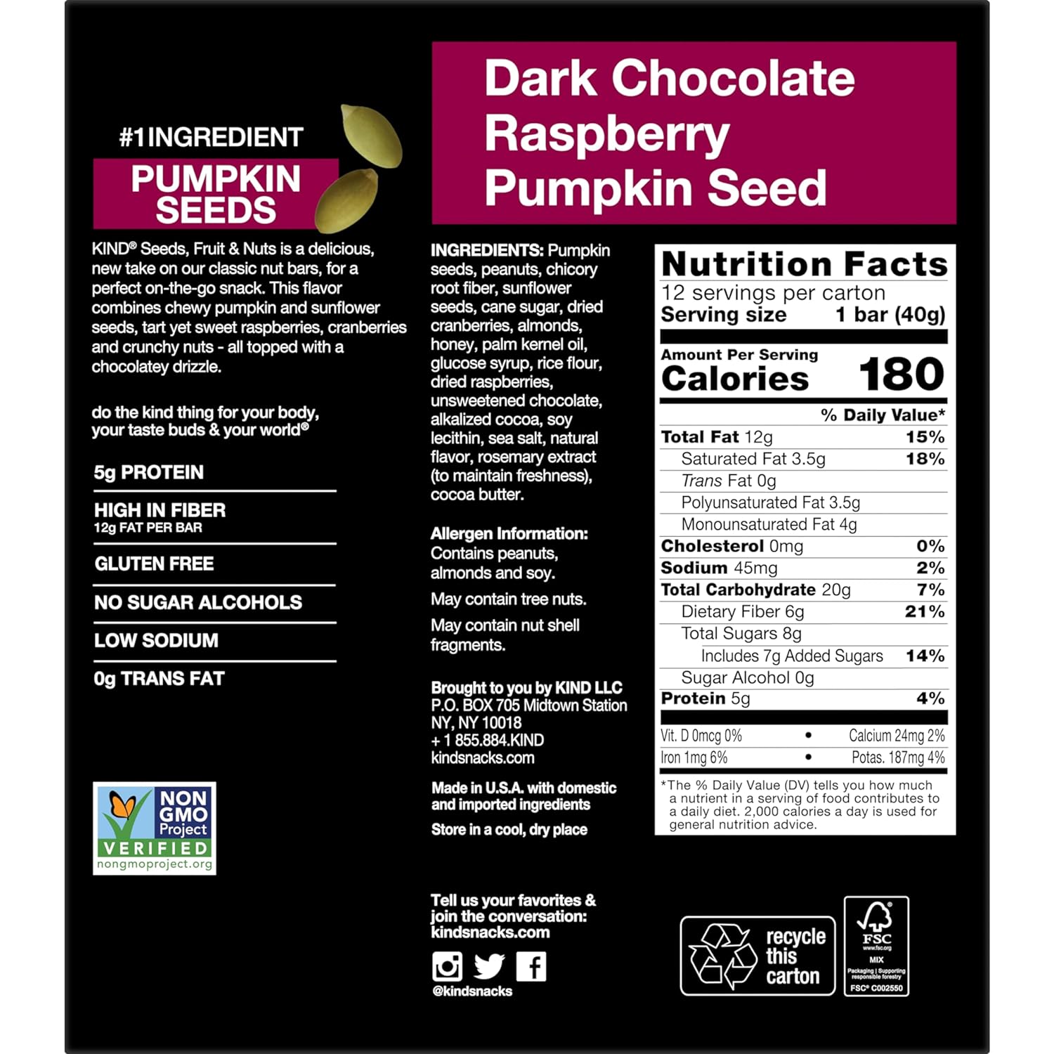 Kind Seeds Fruit & Nuts Snack Bar, Dark Chocolate Raspberry Pumpkin Seed | 5G Protein, High Fiber, Gluten Free Bars, 1.4 Oz, 12 Count